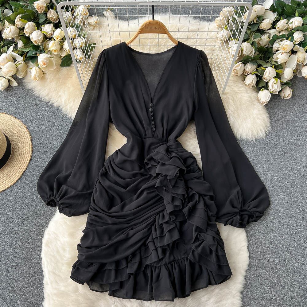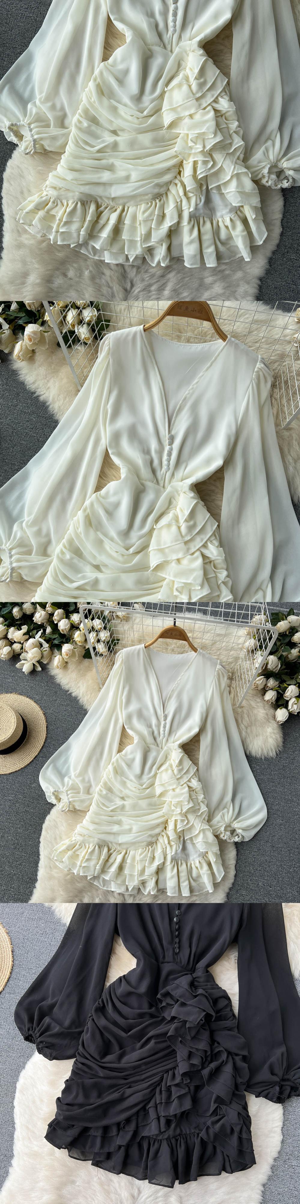 2022 early spring V-neck slim high waist sexy folded fungus edge irregular bubble wrap hip fishtail dress ハイウェスト スプリング 春物 Vネック スリム lyxaj77718833970