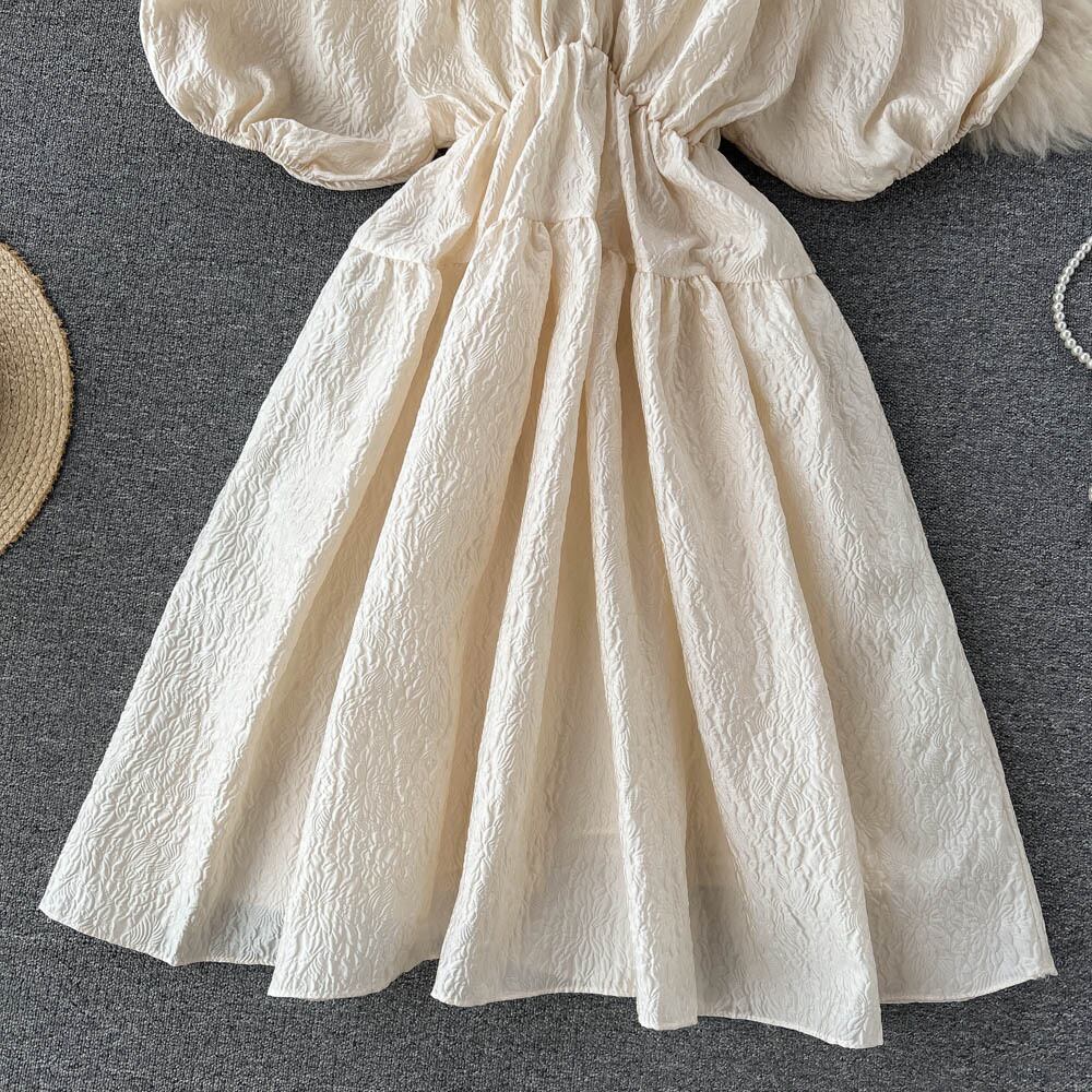2022年夏新作デザイン立体ジャカードVネックパフスリーブワンピースレディースサマーミドル丈パフィースカート 夏物 lyxaj48773088451