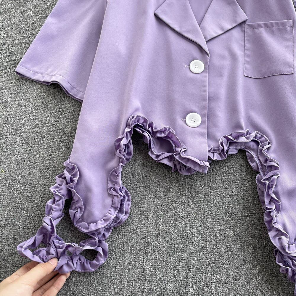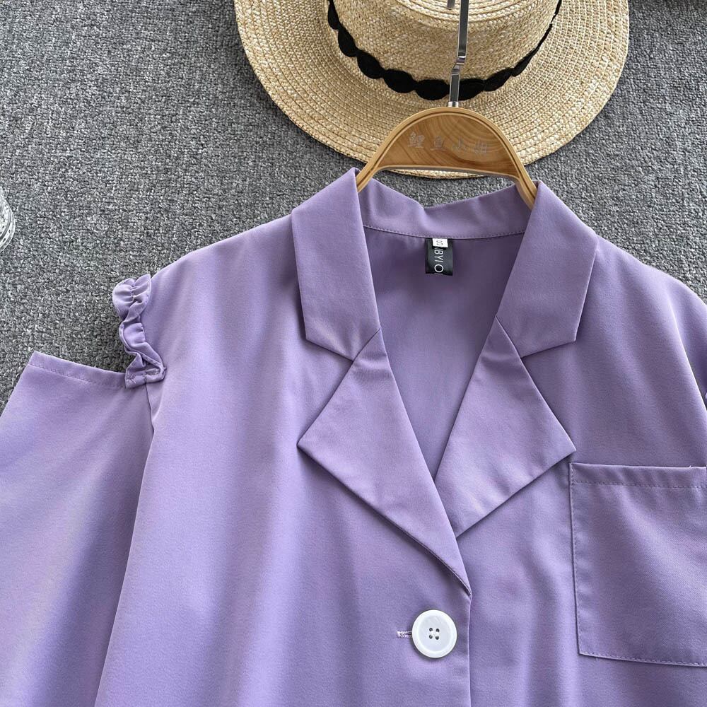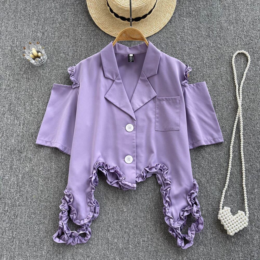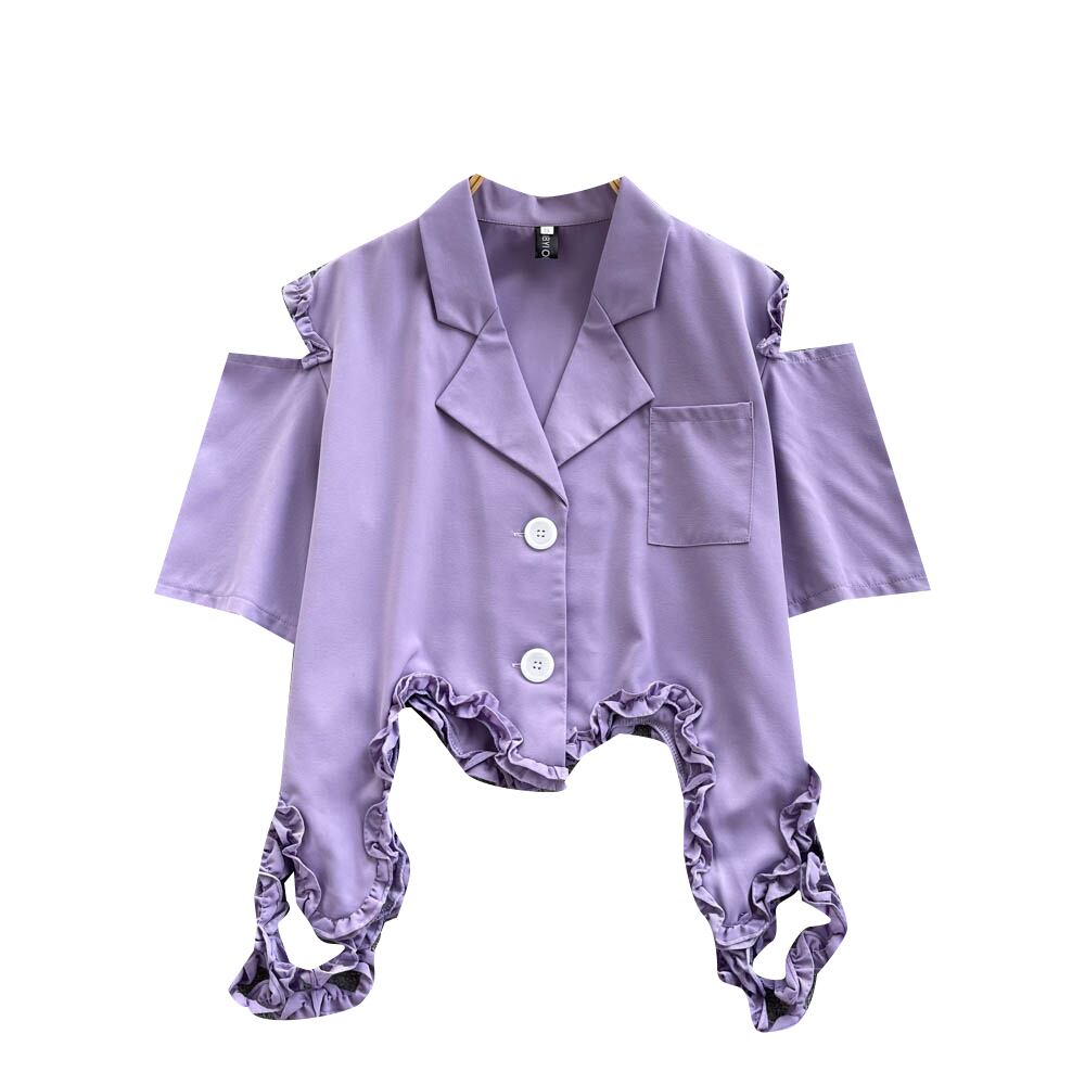 デザインセンスニッチパープルレースくり抜いたショートシャツレディースイレギュラーショルダー半袖スモールスーツ洋風シャツ lyxaj24552577530