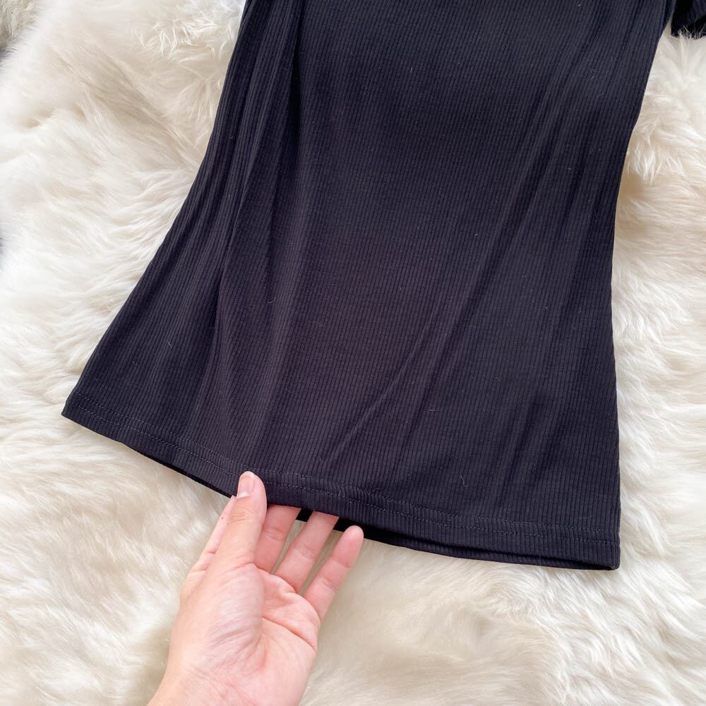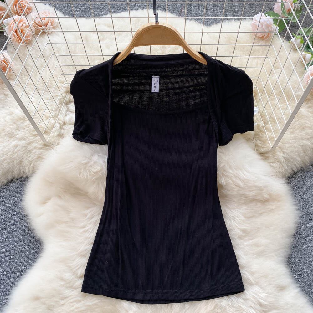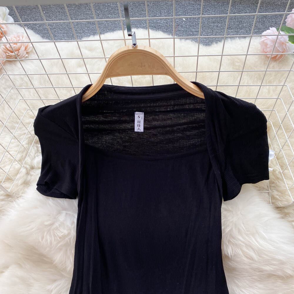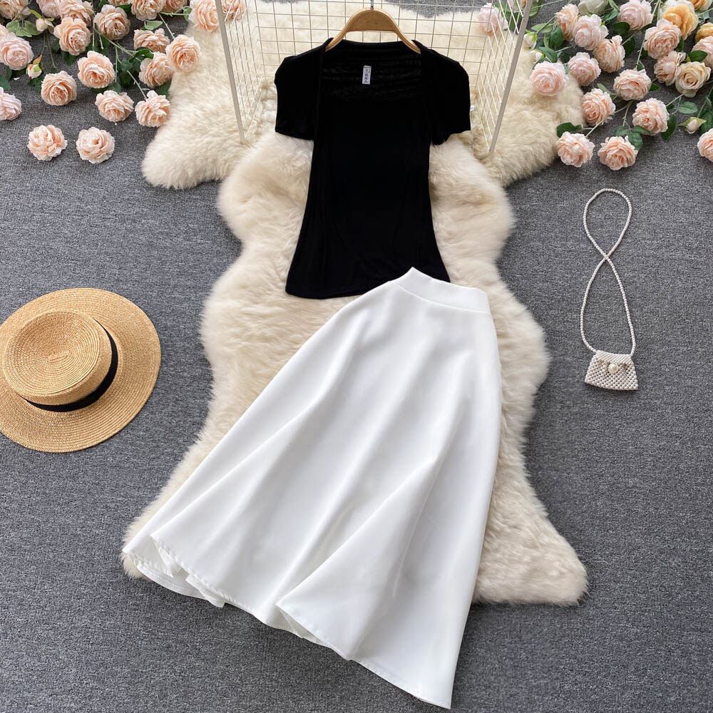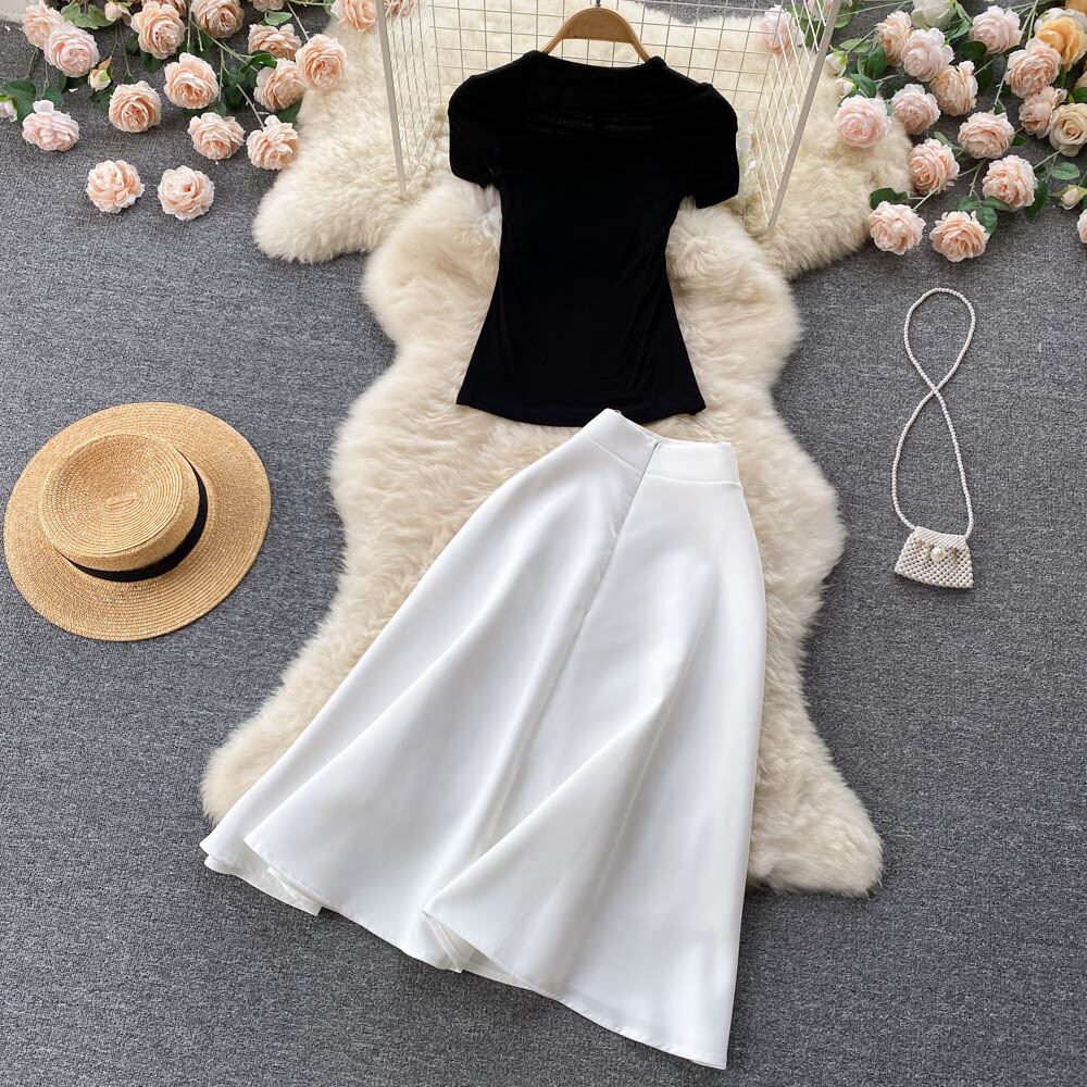 スモールフレグランススーツスクエアネック気質ニット半袖ブラックトップ+ハイウエストラージスイングスカートヘップバーンツーピースセット ショート ハーフスリーブ スクウェア lyxaj6220453236