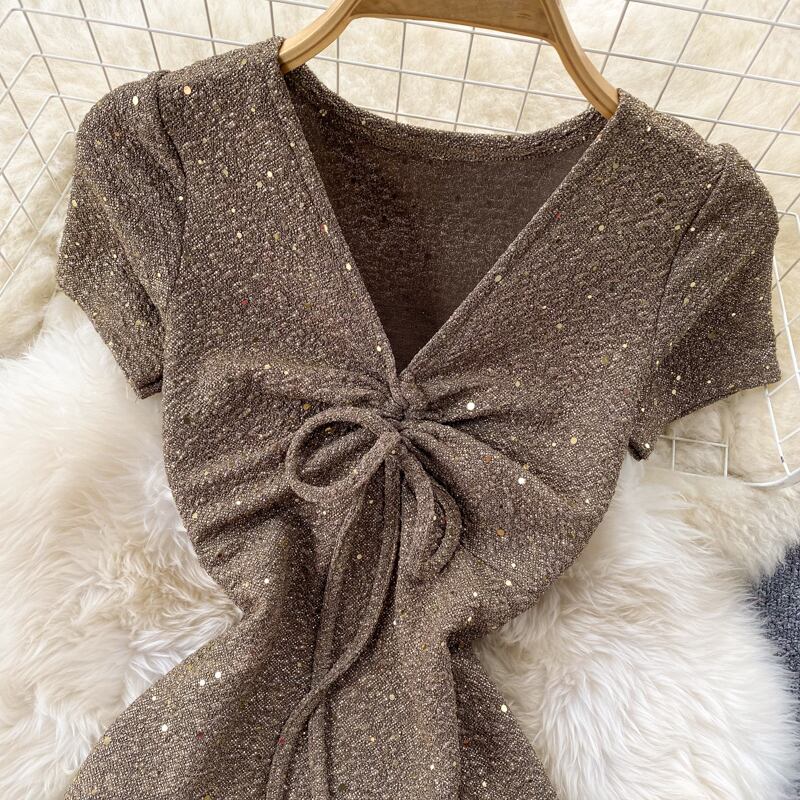 2022年夏の新しいフランスの光沢のあるVネックプリーツボウタイウエスト半袖フィッシュテールドレス リボン サマー 夏物 lyxaj77395436016