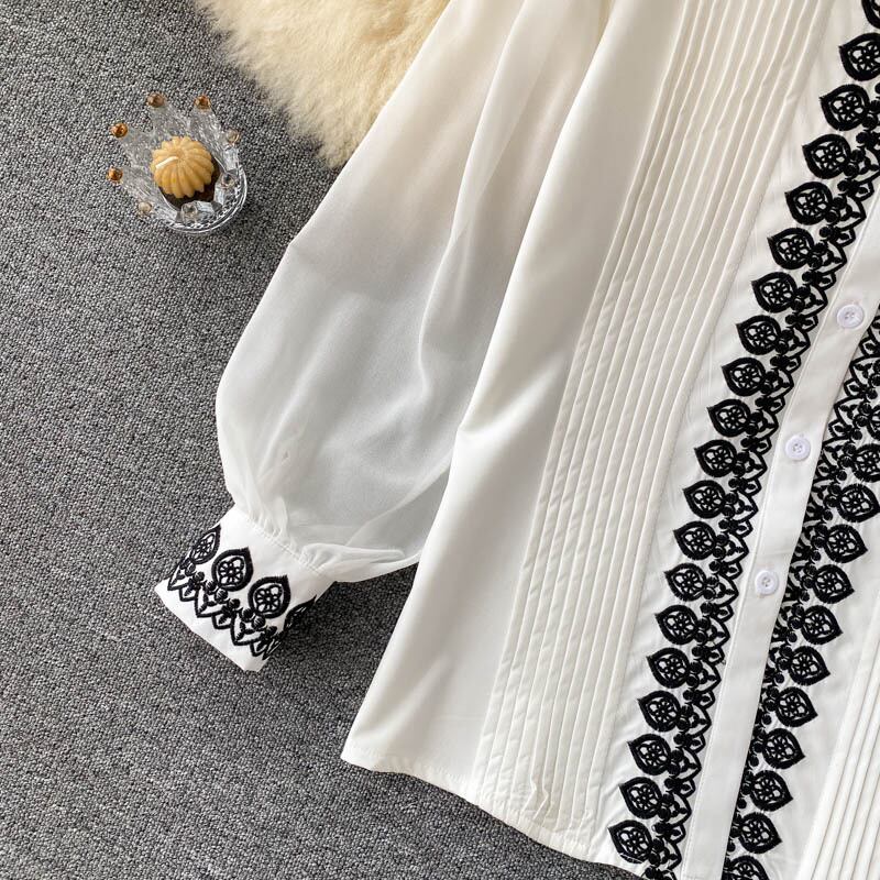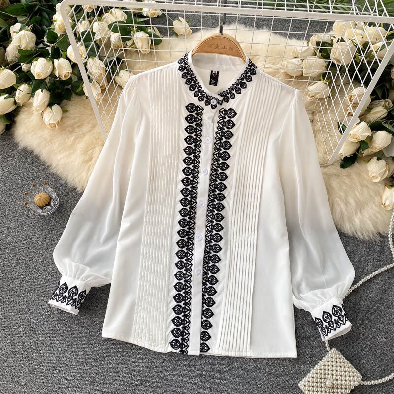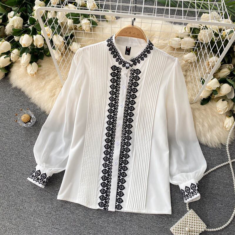 セレブスタイルの気質レディースシャツレトロ重工業刺繍ラウンドネック重工業プリーツスリムフィットオールマッチシフォントップ女性 Oネック lyxaj68695915123