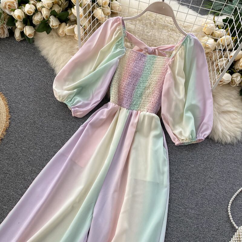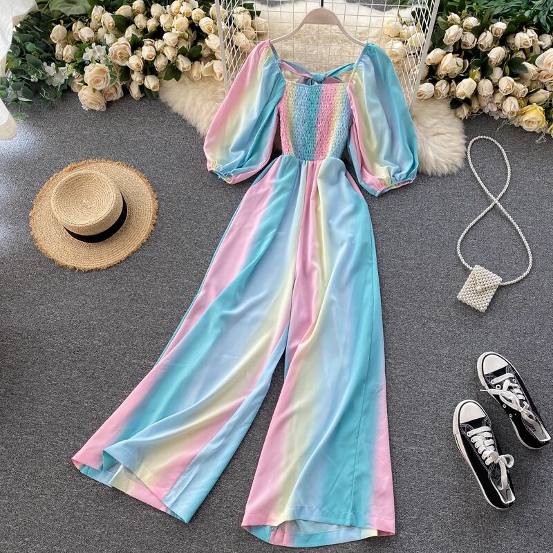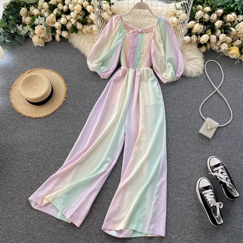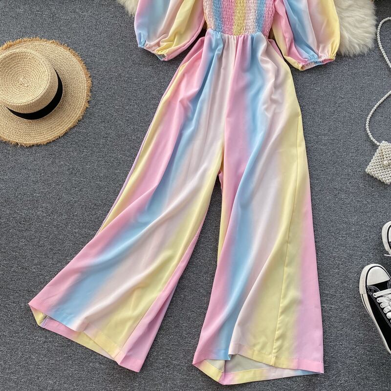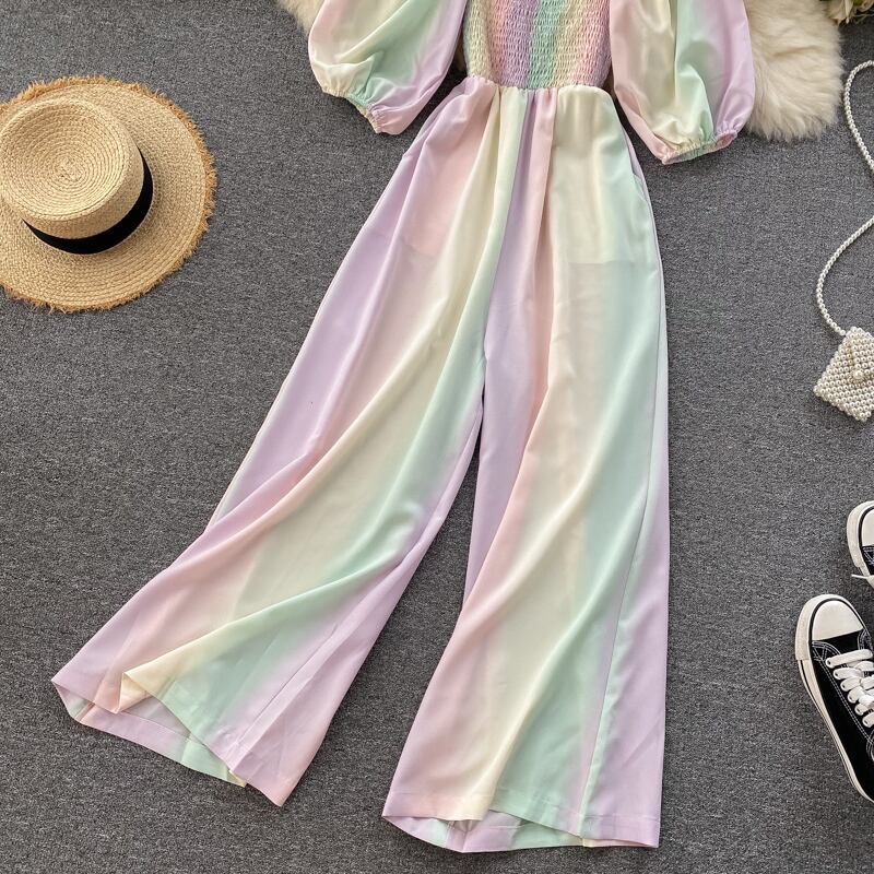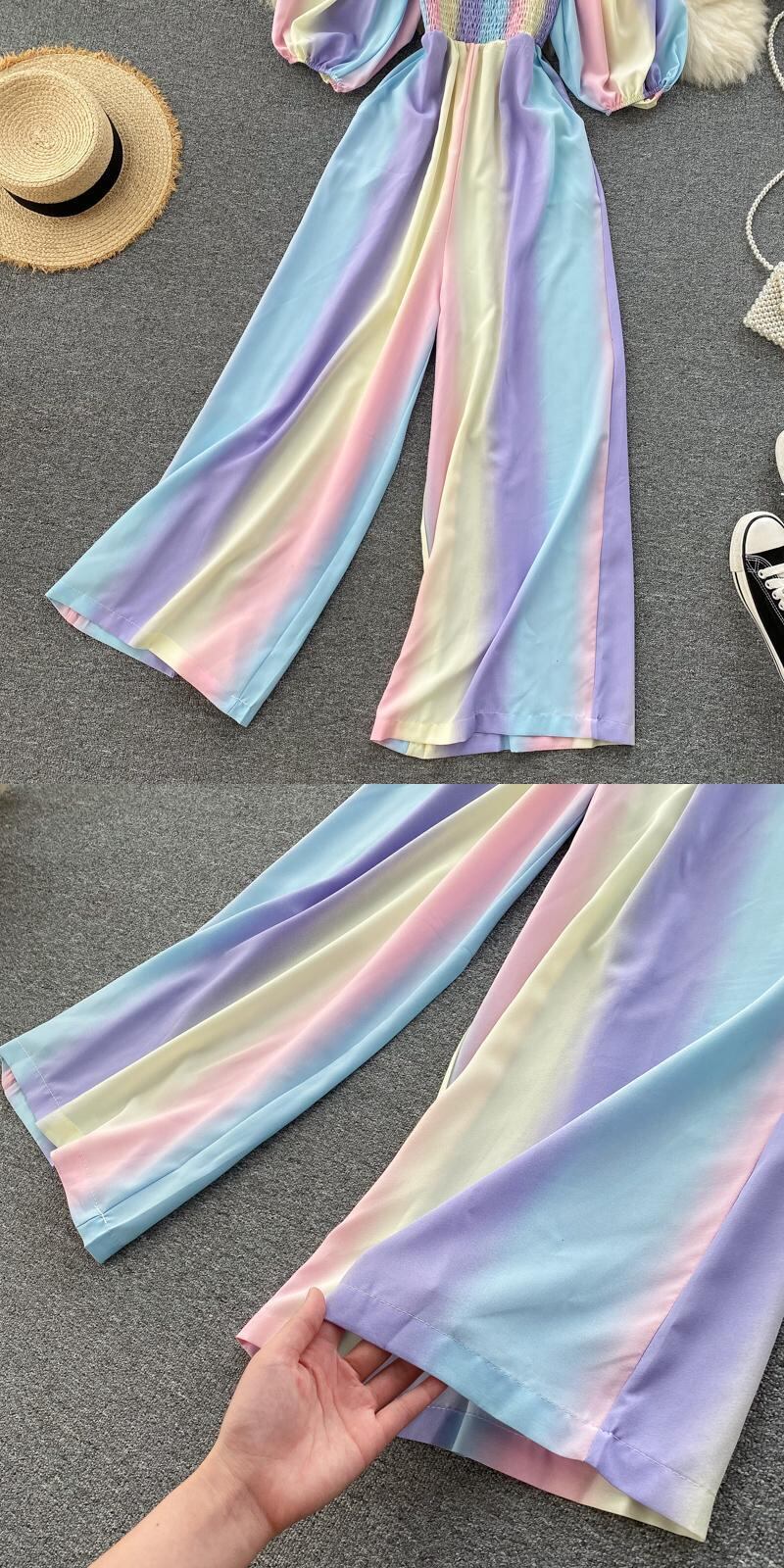 ホリデースタイルのジャンプスーツ初秋新婦人服デザイングラデーションレインボーカラースウィートパフスリーブウエストワイドレッグパンツ 大人ガーリー キュート カジュアル オータム 秋物 lyxaj72062514634