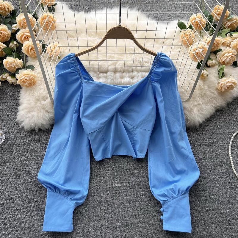 2022年初春新作スクエアカラー半袖トップレディースデザインセンススモール無地オールマッチウエスタンスタイルシャツレディーストレンド ショート ロング 長袖 スプリング 春物 ソリッドカラー スクウェア lyxaj32633154446