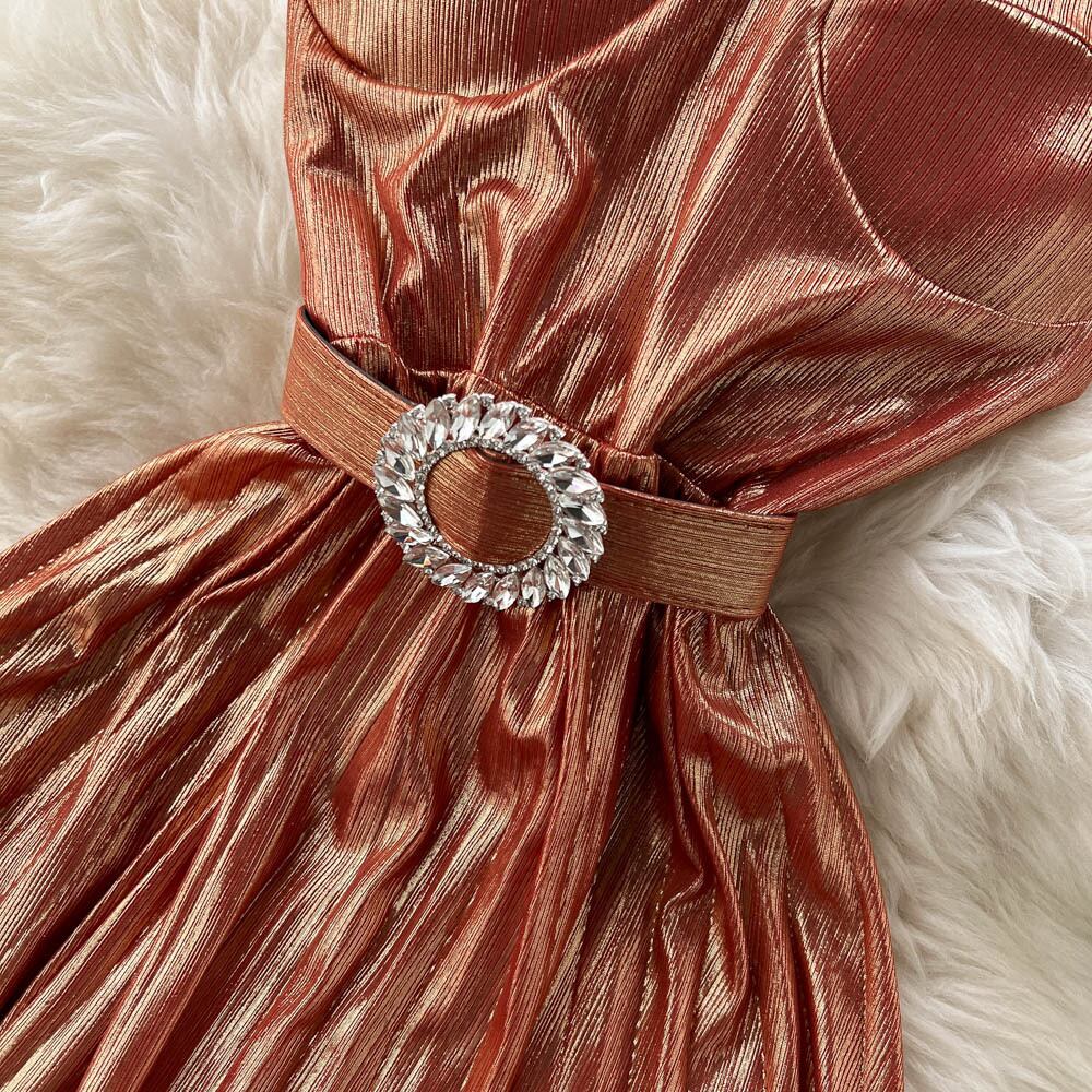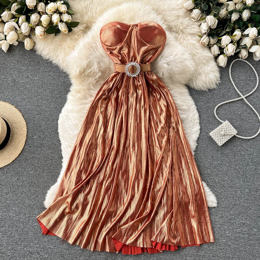 チューブトップオープンバックプリーツスリーブスリムウエストドレスドレスフェミニンでエレガントなAラインスイング膝上ロングスカート lyxaj44077830644