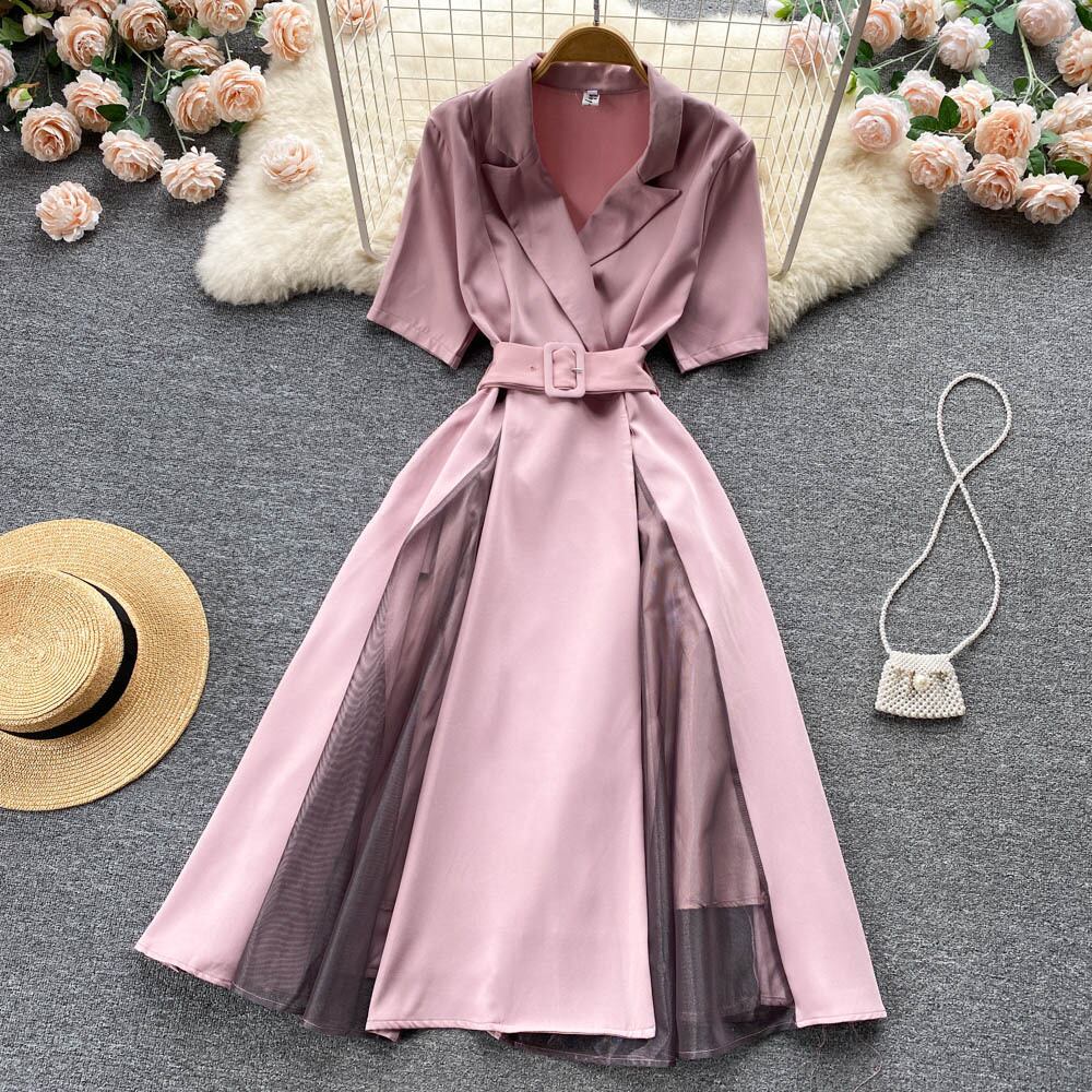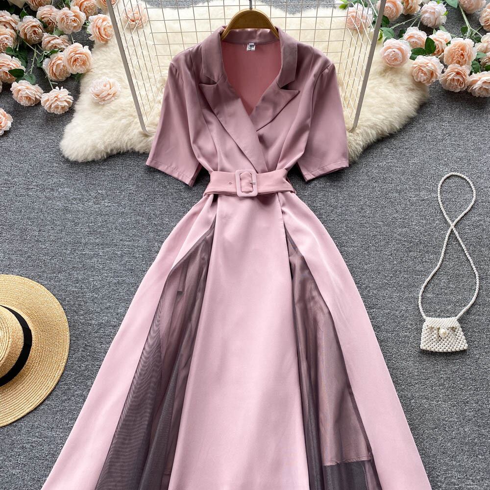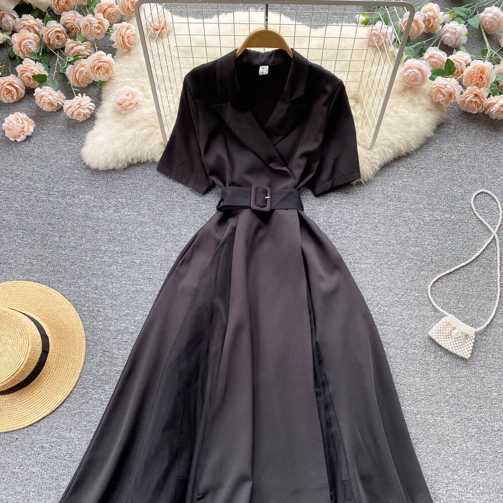 Suit Collar Dress 2022 Summer Dress Short Sleeve French Waist Temperament Mesh Splicing Large Swing Long Skirt ショート ロング 半袖 ハーフスリーブ サマー 夏物 メッシュ スカート lyxaj78190542552