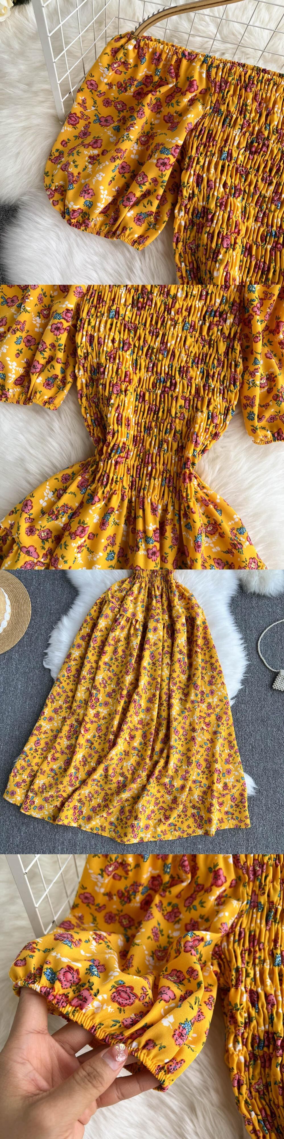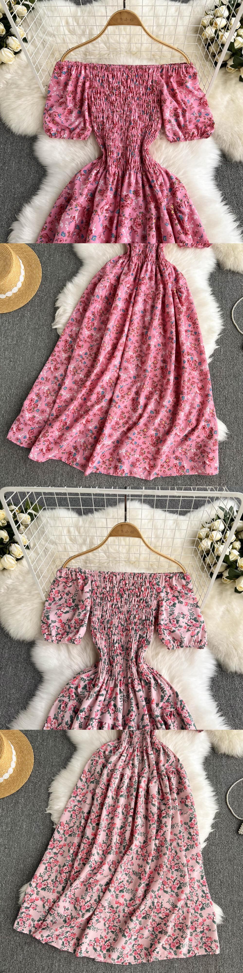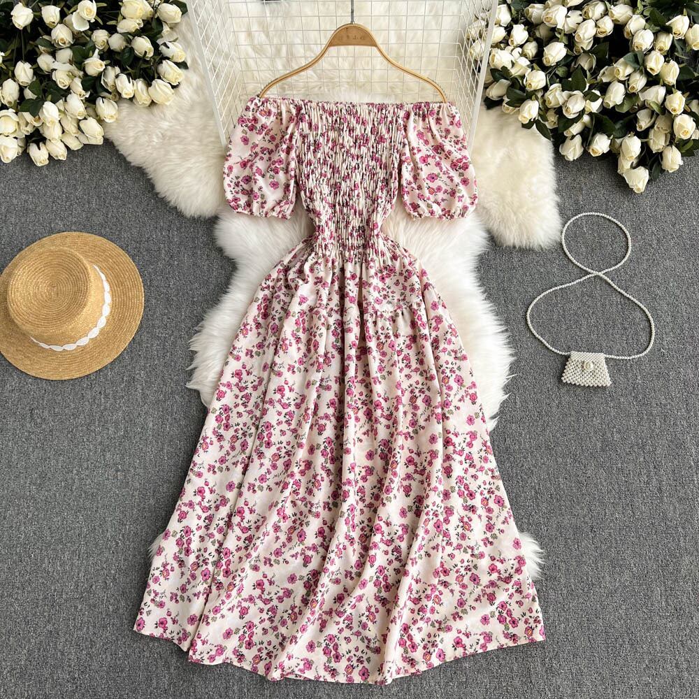 シーサイドホリデードレスレディースセクシーなワンワードネックオフショルダーパフスリーブストレッチスリムミドル丈フローラルビーチドレス 花柄 lyxaj60402149340