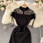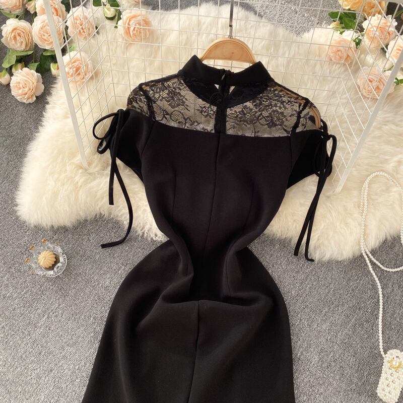 夏の新しいナショナルスタイルのスタンドカラー改良されたセクシーなチャイナドレスレースステッチ半袖ヘップバーンバッグヒップリトルブラックドレス サマー 夏物 lyxaj34641496975