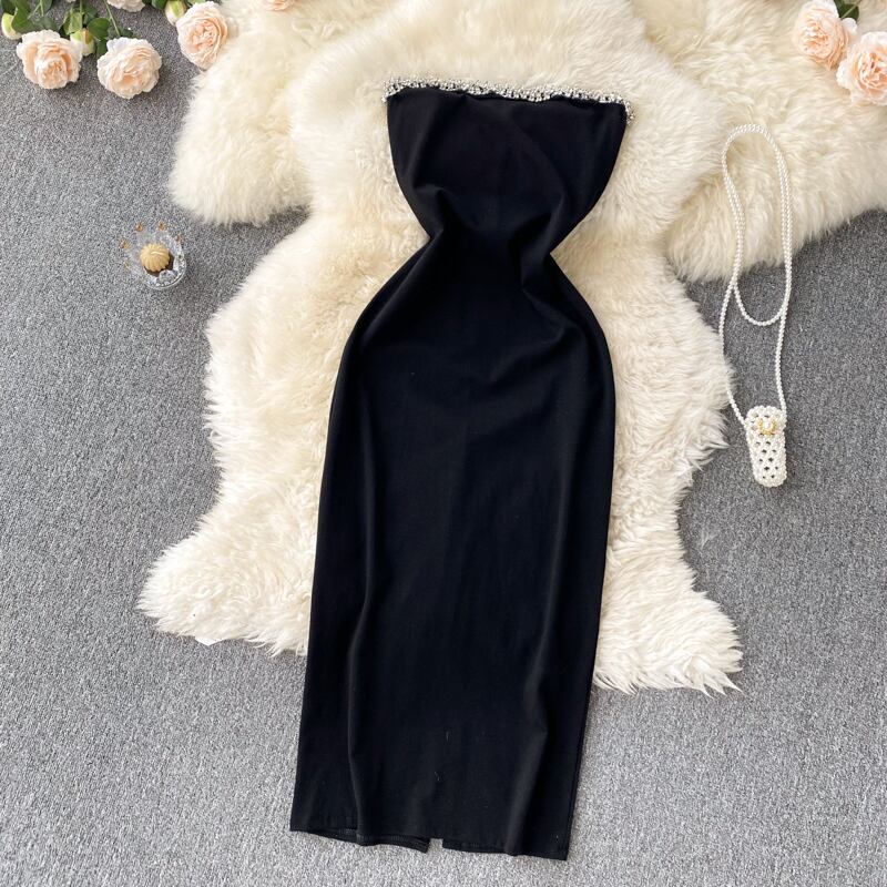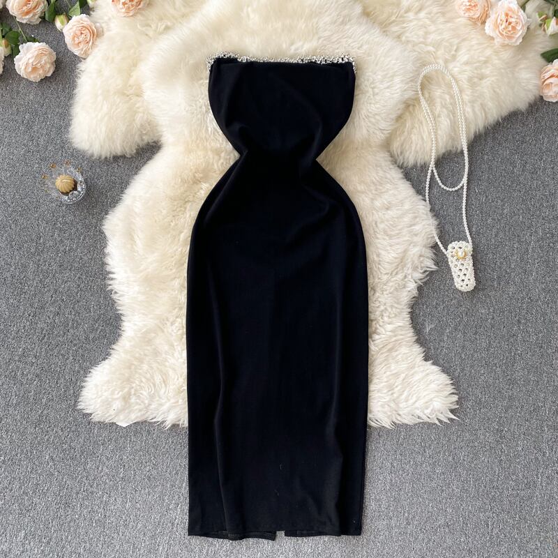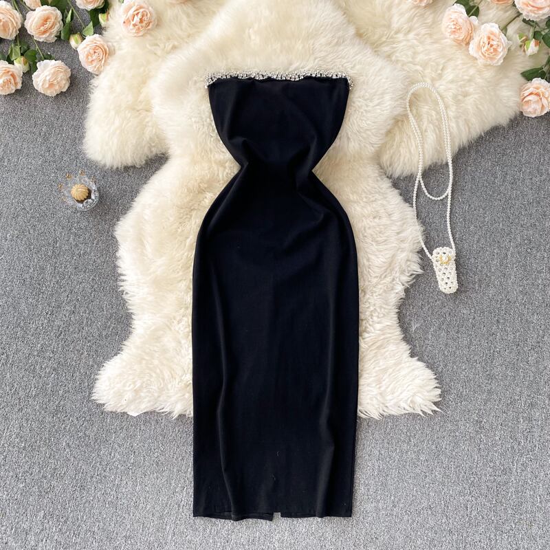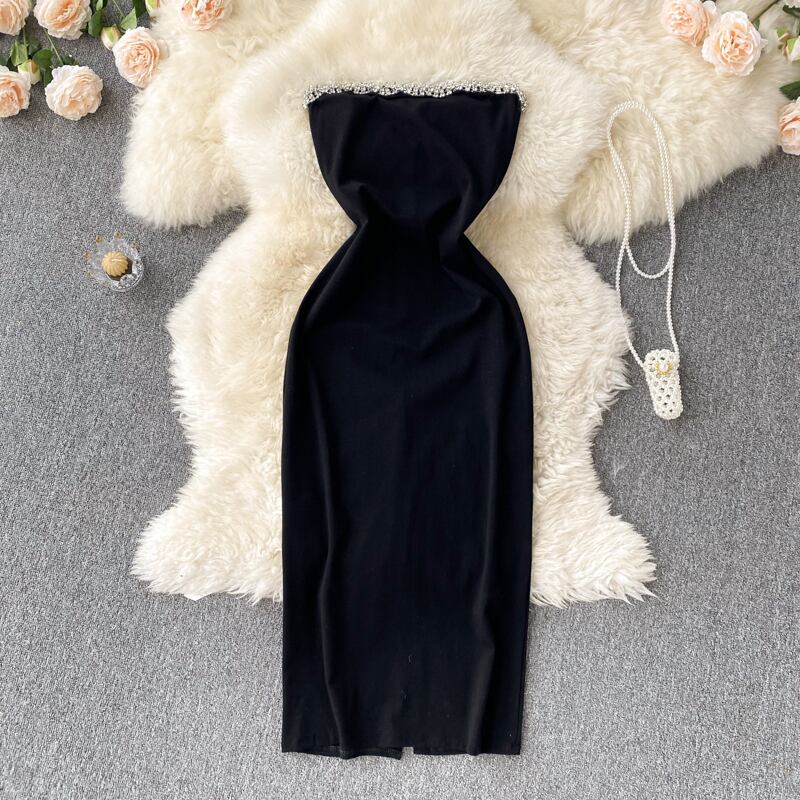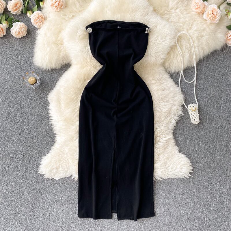 2022年春の新しいフランスのレトロなチューブトップドレスの女性のウエストと小さなスリットのある薄いデザインの小さな黒いドレス ブラック スプリング 春物 lyxaj46310735543