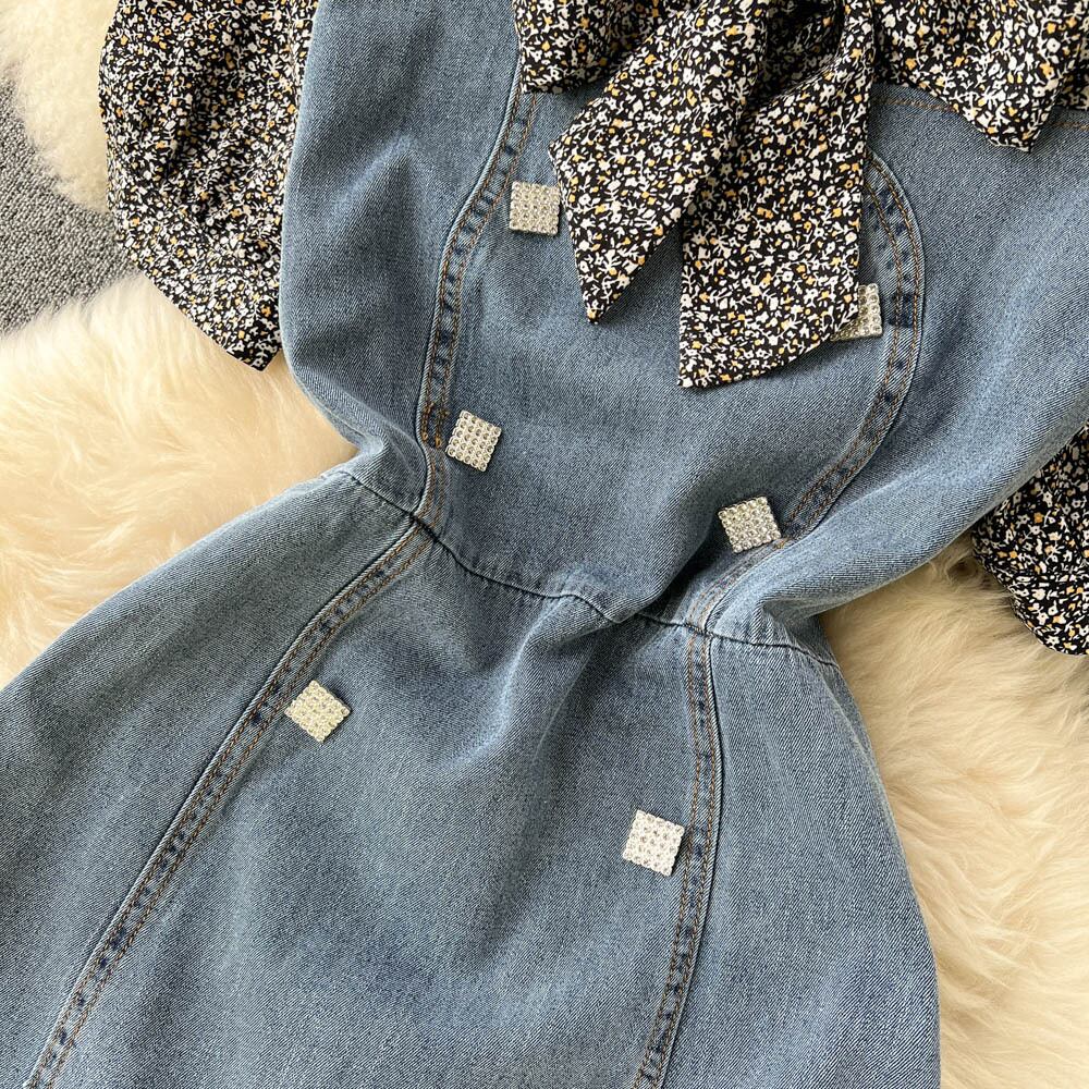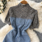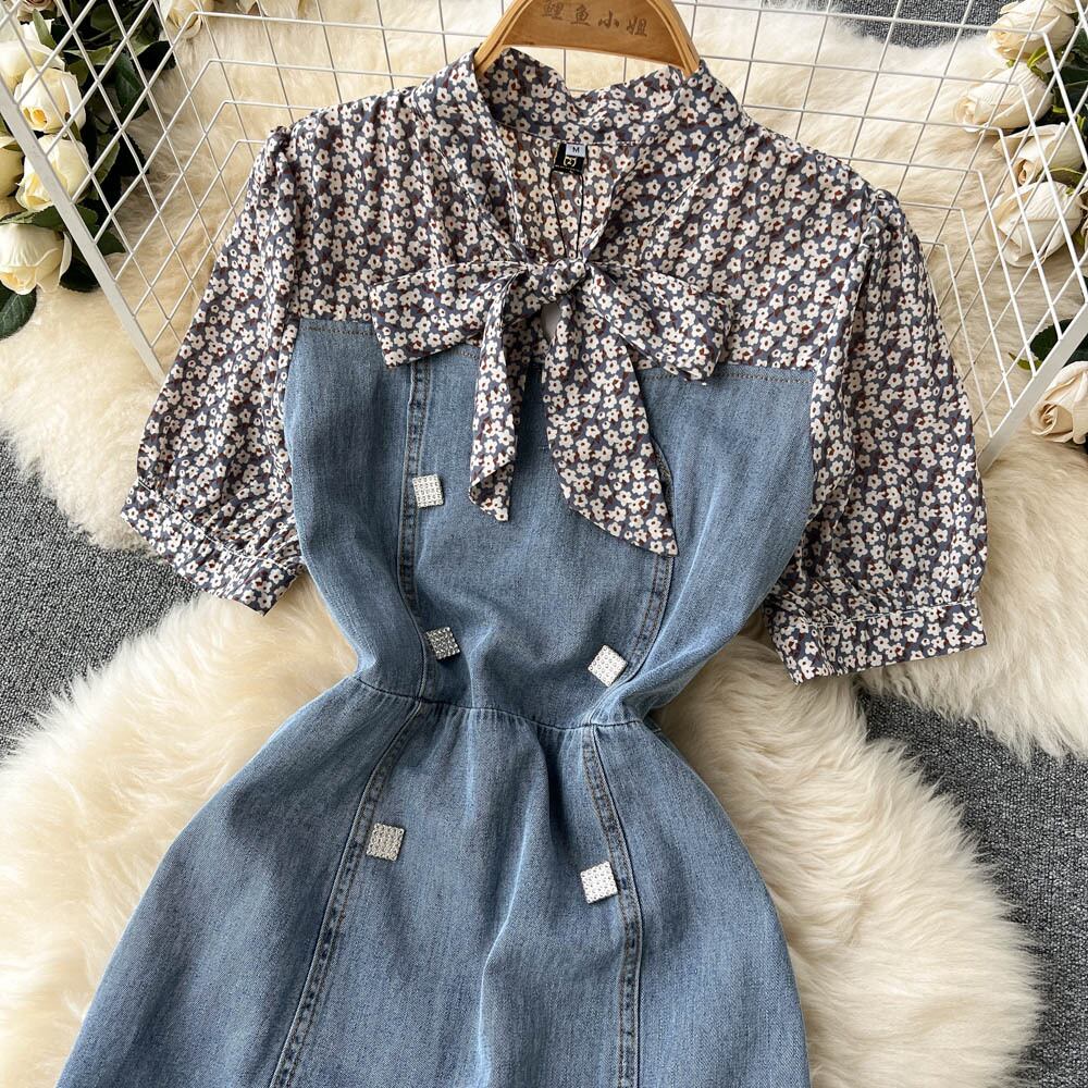 2022年夏の新作Vネックウエストスリムデニムステッチフローラルシフォンワンピースフィッシュテールスカートトレンディ サマー 夏物 花柄 lyxaj3127511203