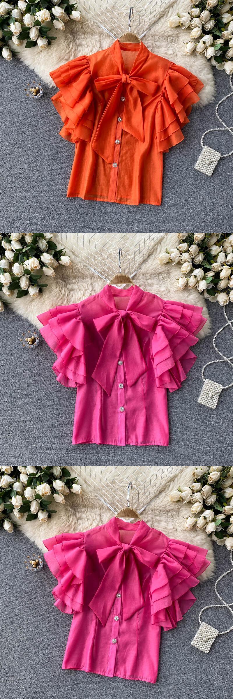 パレススタイルのトップスの女性のデザインセンスは小さく、フリルの袖の多くの層は甘いレースの弓の襟のスリムなシャツの女性 リボン ラッフル 大人ガーリー スウィート キュート カジュアル lyxaj48985961140