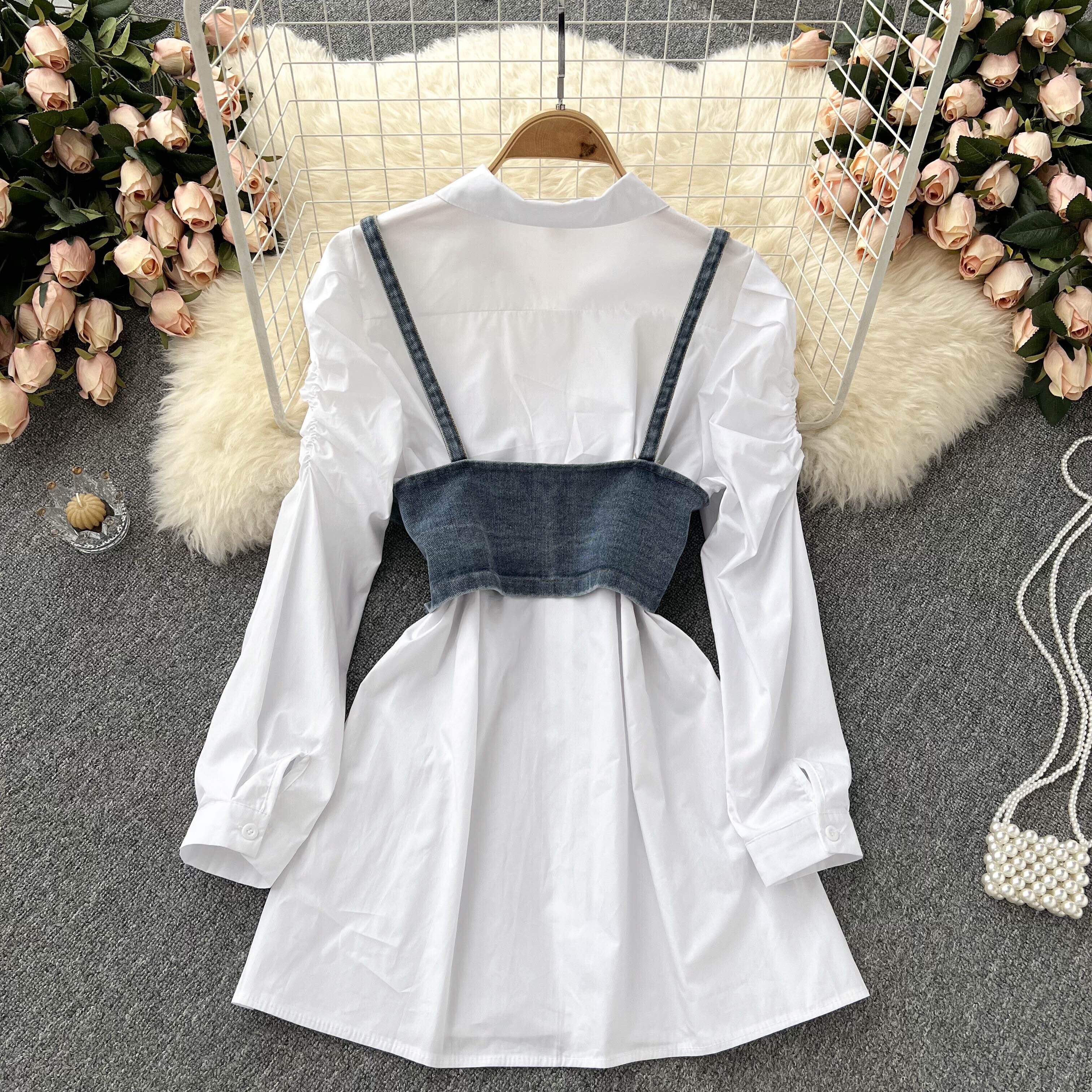 2022年春の新作ラペルパフスリーブホワイトシャツレディース+スプライシングデニムスリングアウターウェアリングウエスタンスタイルツーピースセット スプリング 春物 lyxaj36656349845