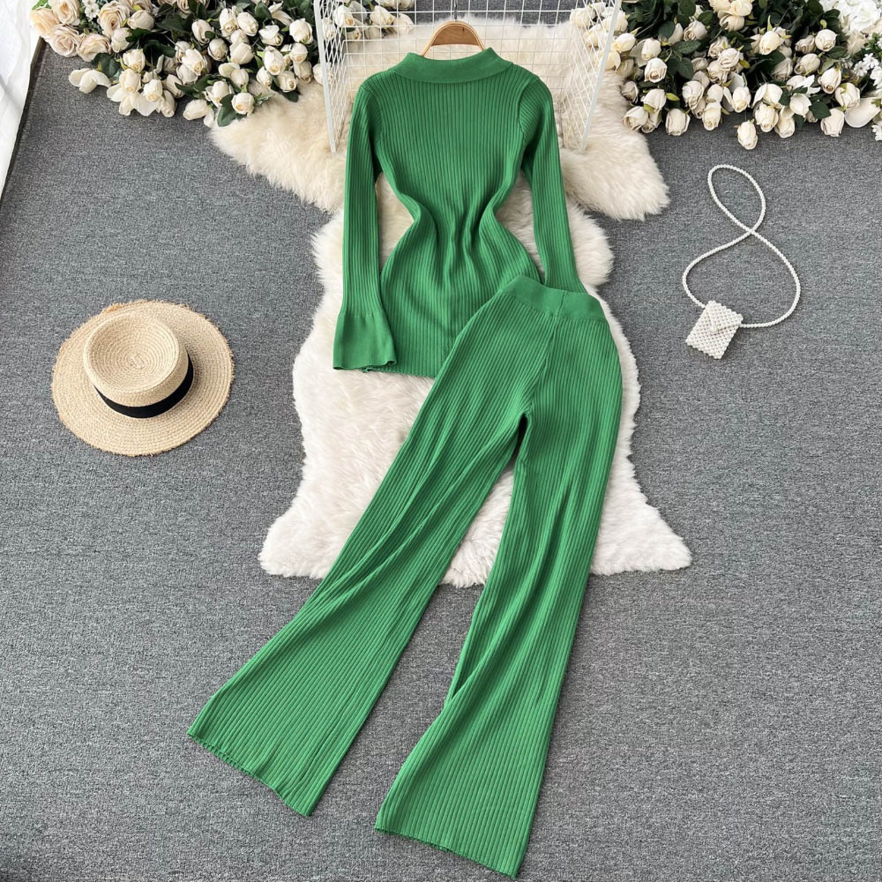 ファッションニットスーツレディースグリーン長袖ラペルセーターカーディガンシャツハイウエストドレープワイドレッグパンツツーピースセット ハイウェスト ロング ワイドパンツ lyxaj83976489908