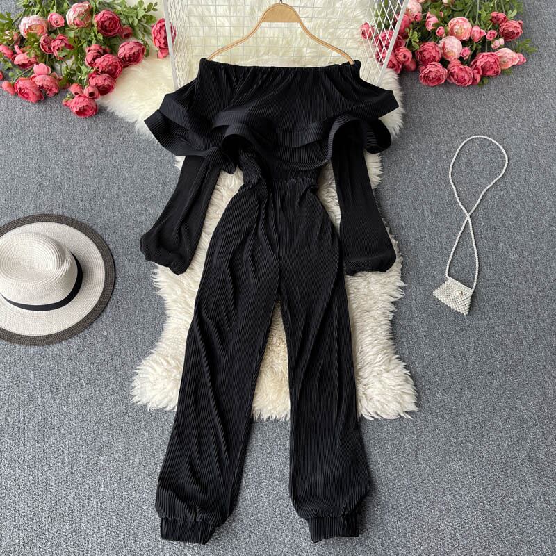 ヨーロッパとアメリカのインデザインセンスニッチ三次元蓮の葉ワンワードネックオフショルダーパフスリーブスリムロングジャンプスーツ女性 ヨーロピアン lyxaj48473063651