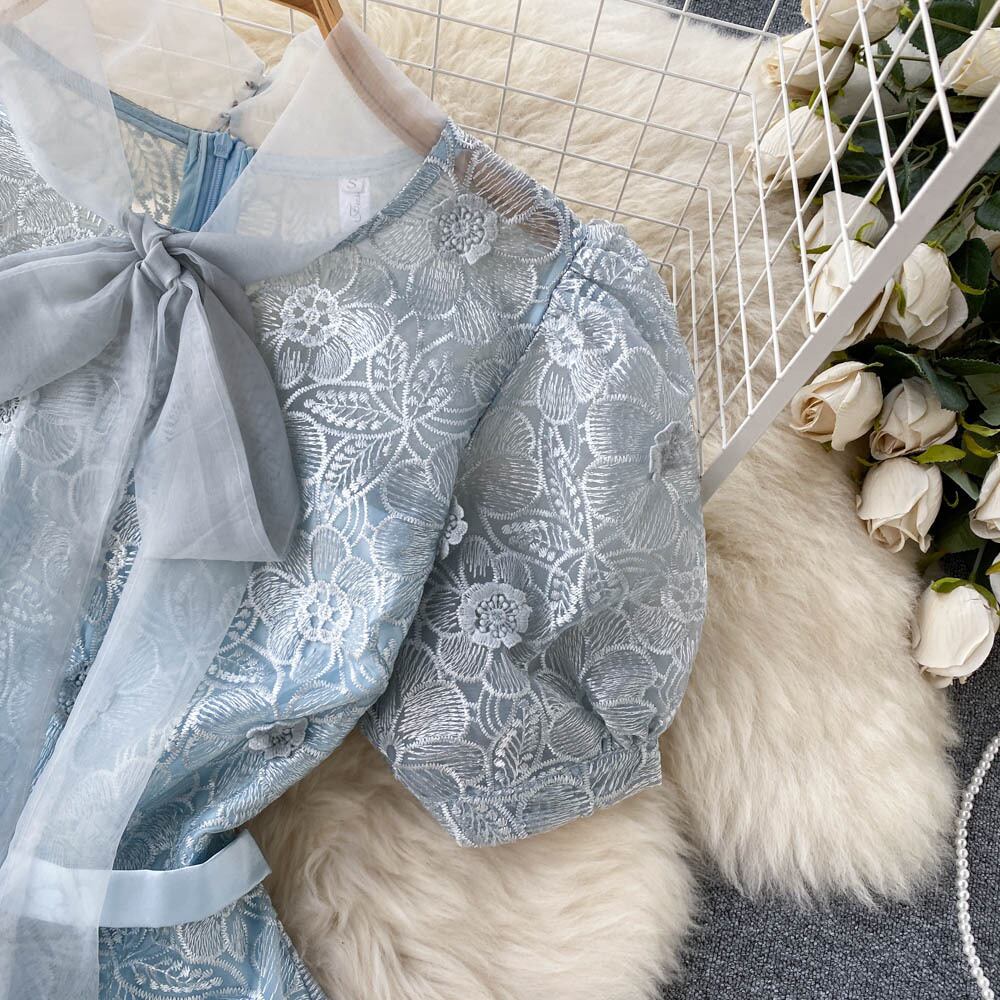 レディースボウメッシュステッチレース半袖韓国版フローラルドレス優しいシフォンロングスカート女性Aラインスカート リボン 花柄 lyxaj65716166819