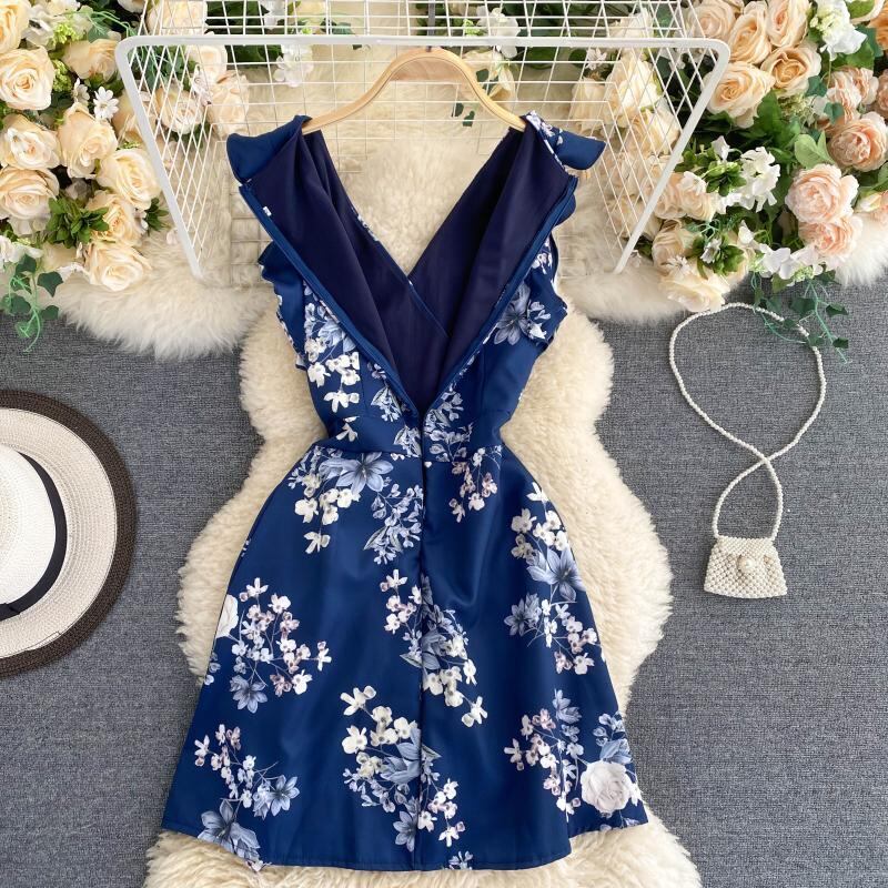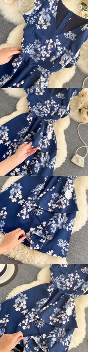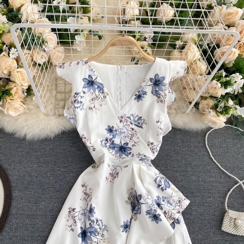 甘いFeifei袖気質Vネックデザインセンス不規則なフリルウエストウエストショー薄いショートフローラルドレス女性 ラッフル 大人ガーリー スウィート キュート カジュアル 花柄 lyxaj85083303083