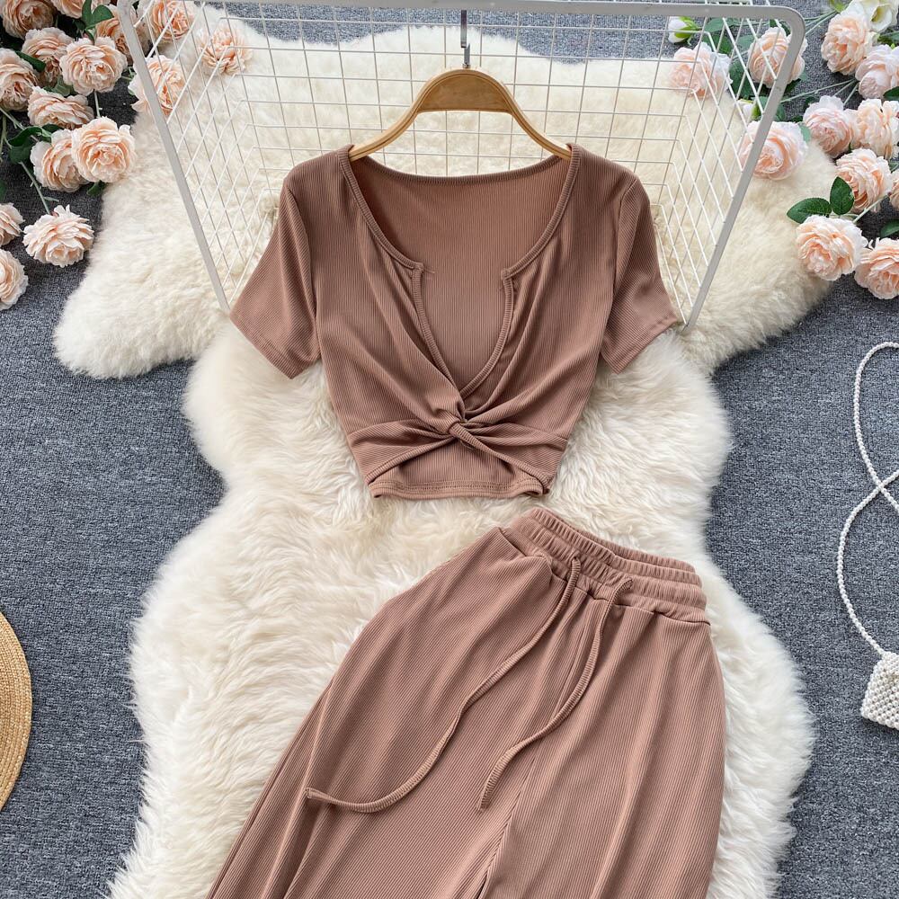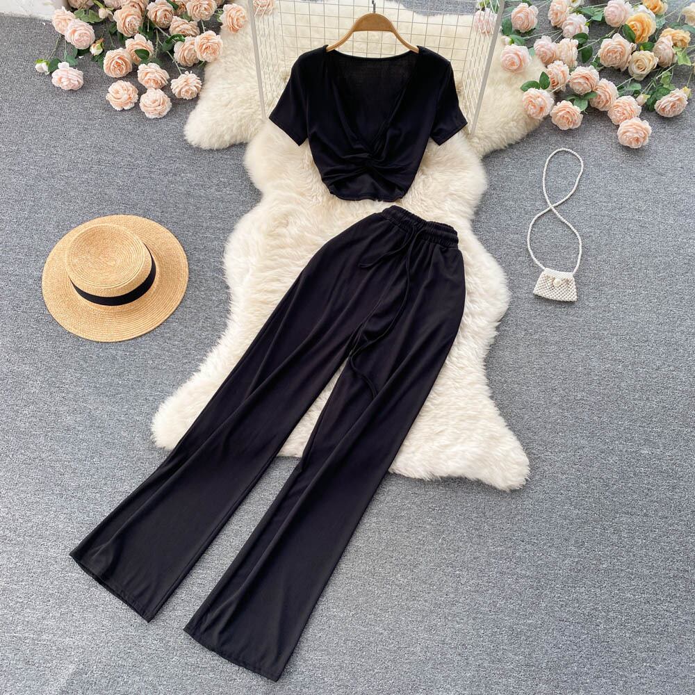 ホットガール気質スーツ女性ショートデザインクロスショートTシャツトップハイウエストドレープワイドレッグパンツツーピースセット ハイウェスト ワイドパンツ lyxaj25550149113