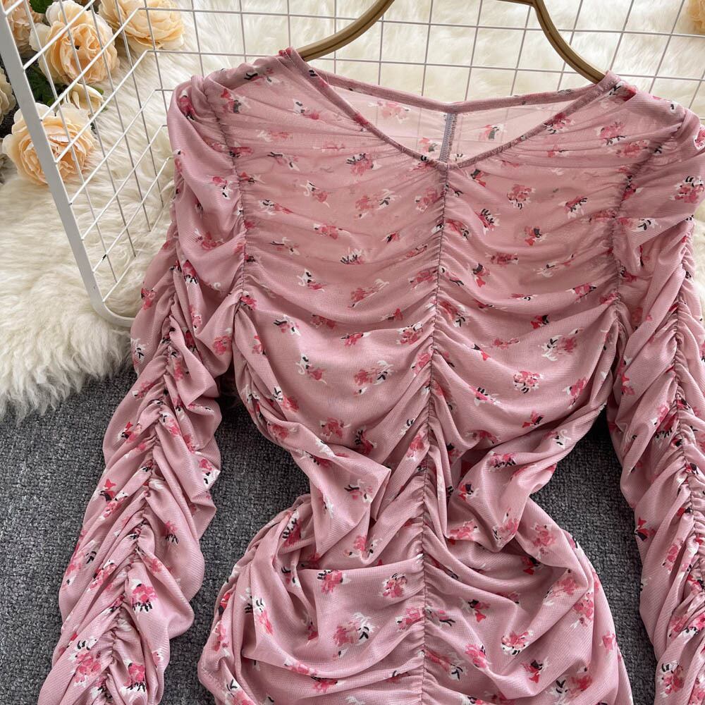 ニッチなデザインセンスプリーツスリム長袖Tシャツボトミングシャツレディース気質Vネックオールマッチ薄くて甘いプリントトップス ロング 大人ガーリー スウィート キュート カジュアル lyxaj97418497242