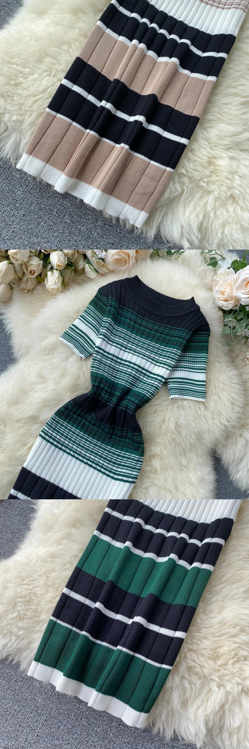 半袖ドレス2020新しい初夏の女性のレトロなカラーマッチングストライプは、ウエストとヒップの伸縮性のあるニットオーバーザニースカートを示しています エラスティック サマー 夏物 lyxaj91496040926