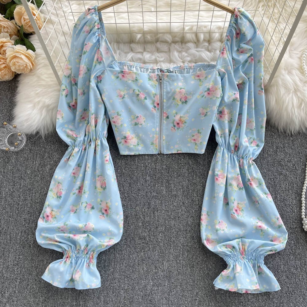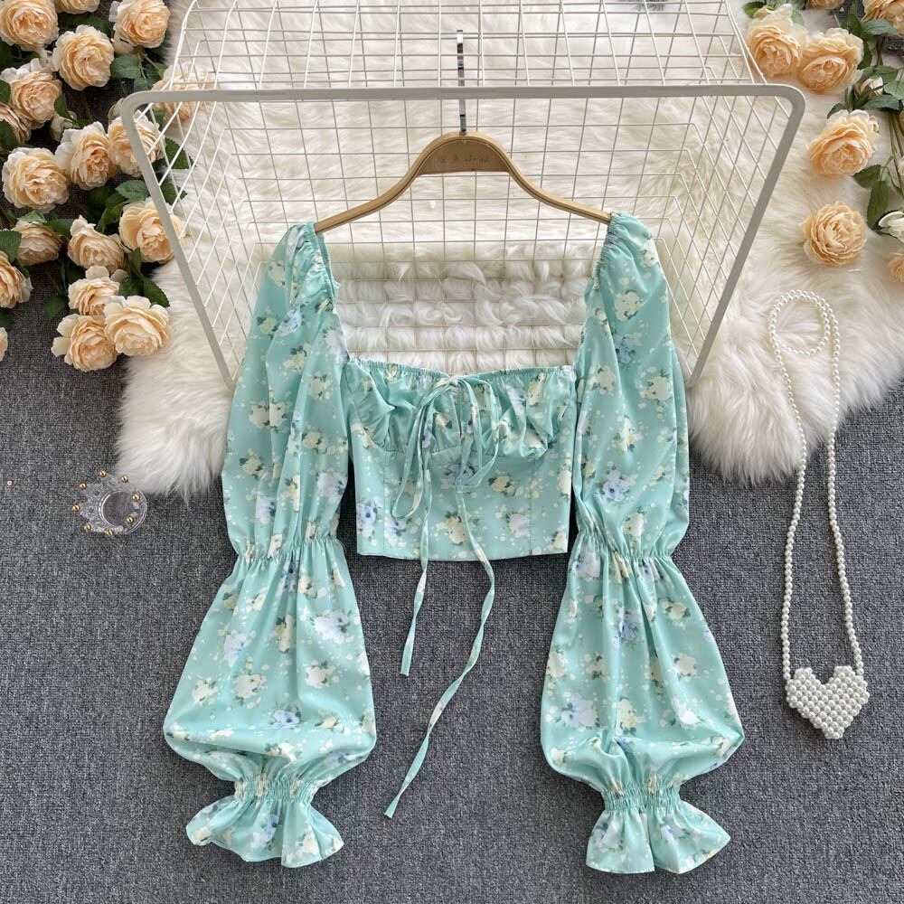マシンカラーボーンフローラルシャツレディースデザインセンススモールスクエアネックネクタイランタンスリーブホットガールショートクロップトップにご注意ください 花柄 スクウェア lyxaj79117480150