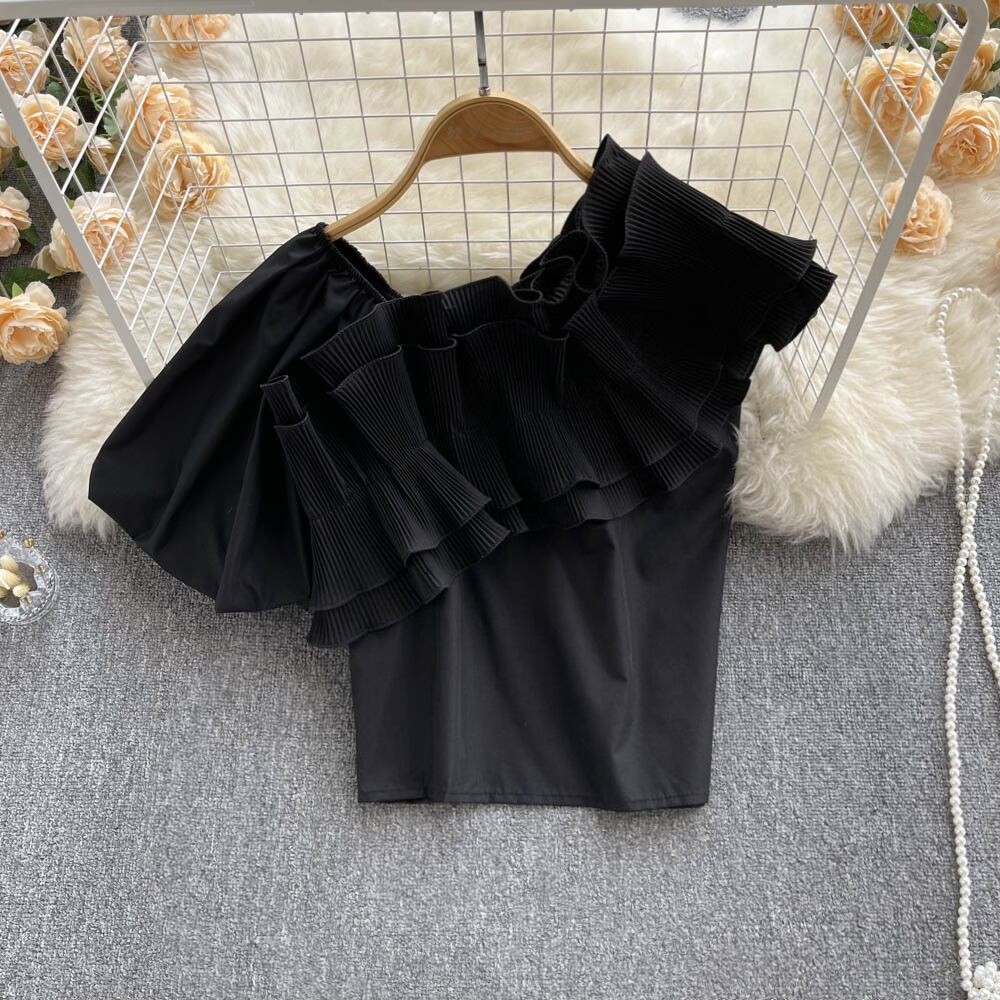 デザインセンスニッチ香港風味のフリルワンショルダーシャツVネックオフショルダーセクシー注意マシンイレギュラートップ女性 レッド lyxaj69368228786