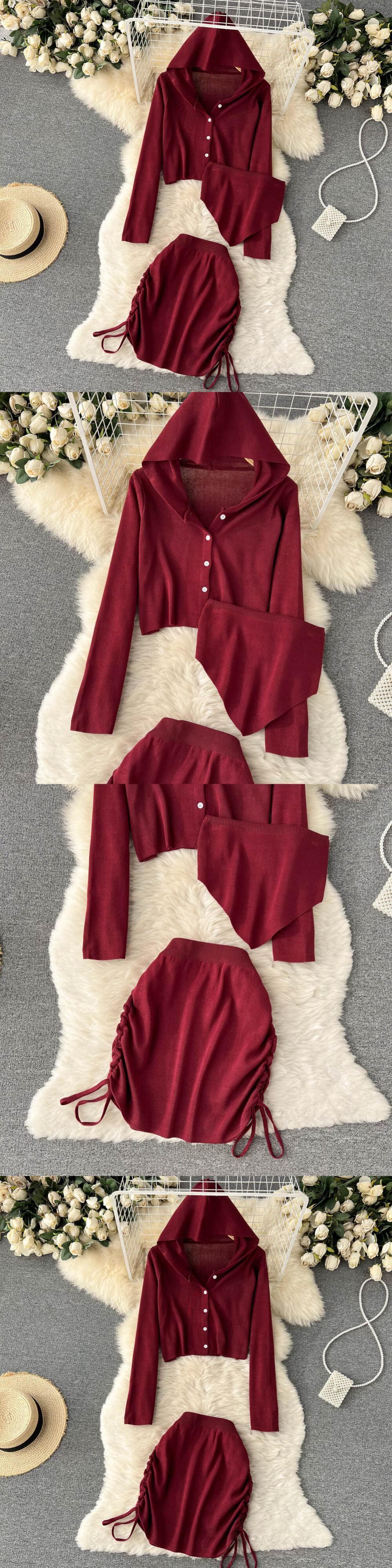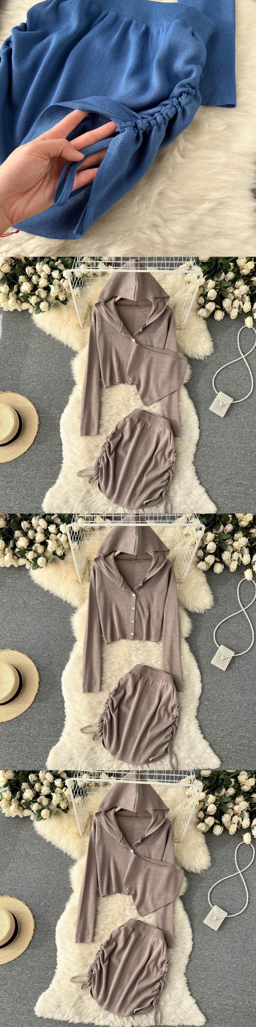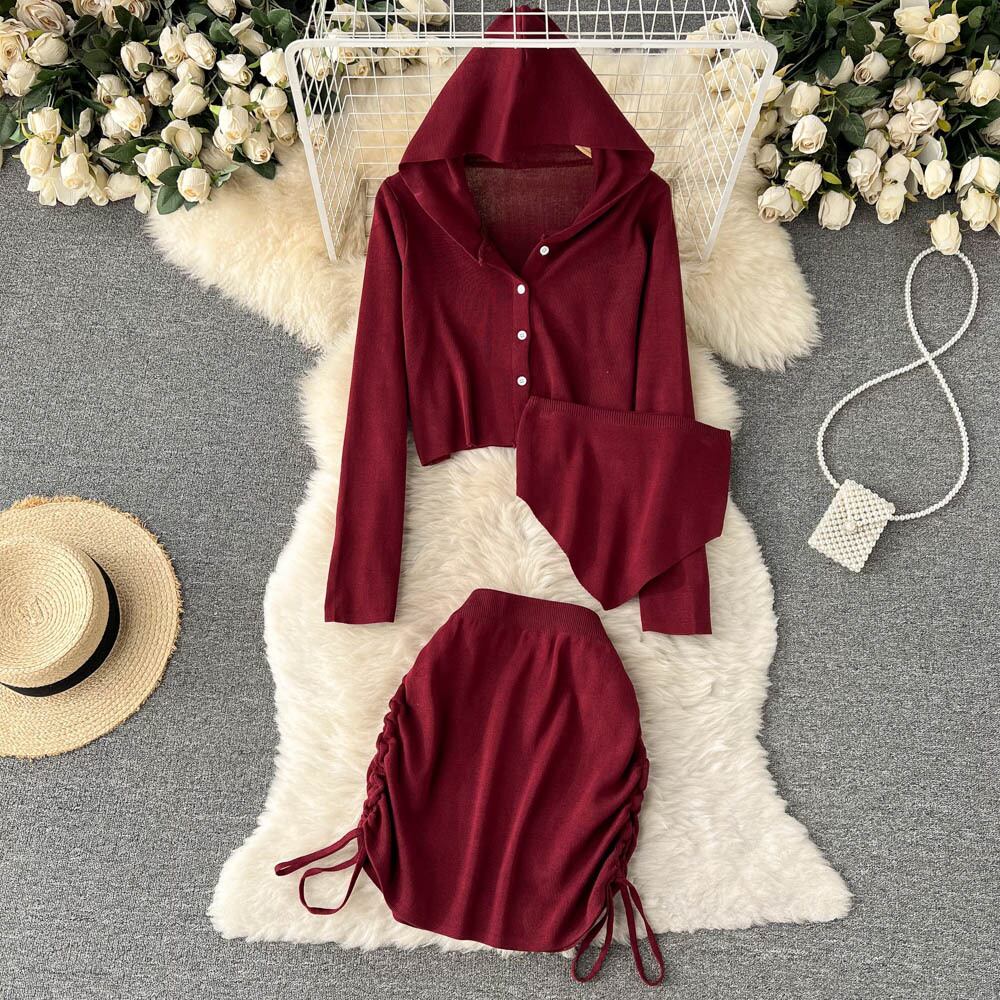 ファッションスーツレディースフード付きセーターニットカーディガンコートチューブトップハイウエストバッグヒップショートスカートカジュアルスリーピースセット ハイウェスト lyxaj99208526359