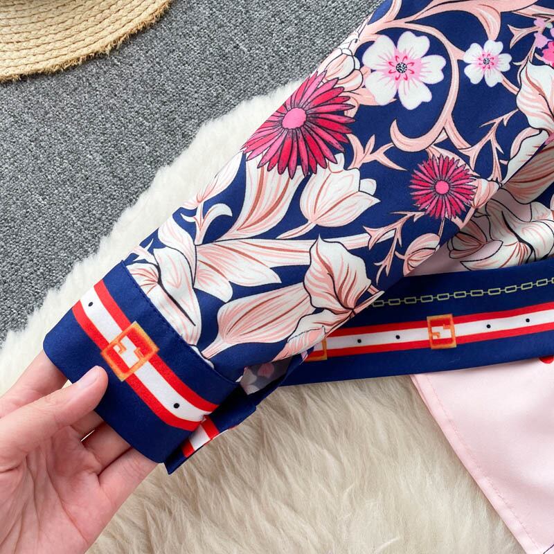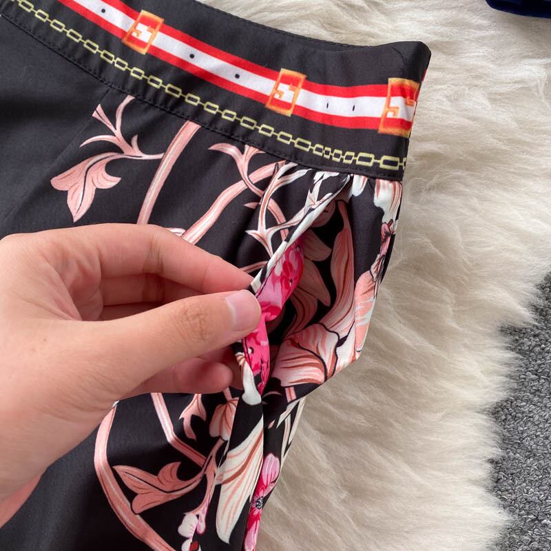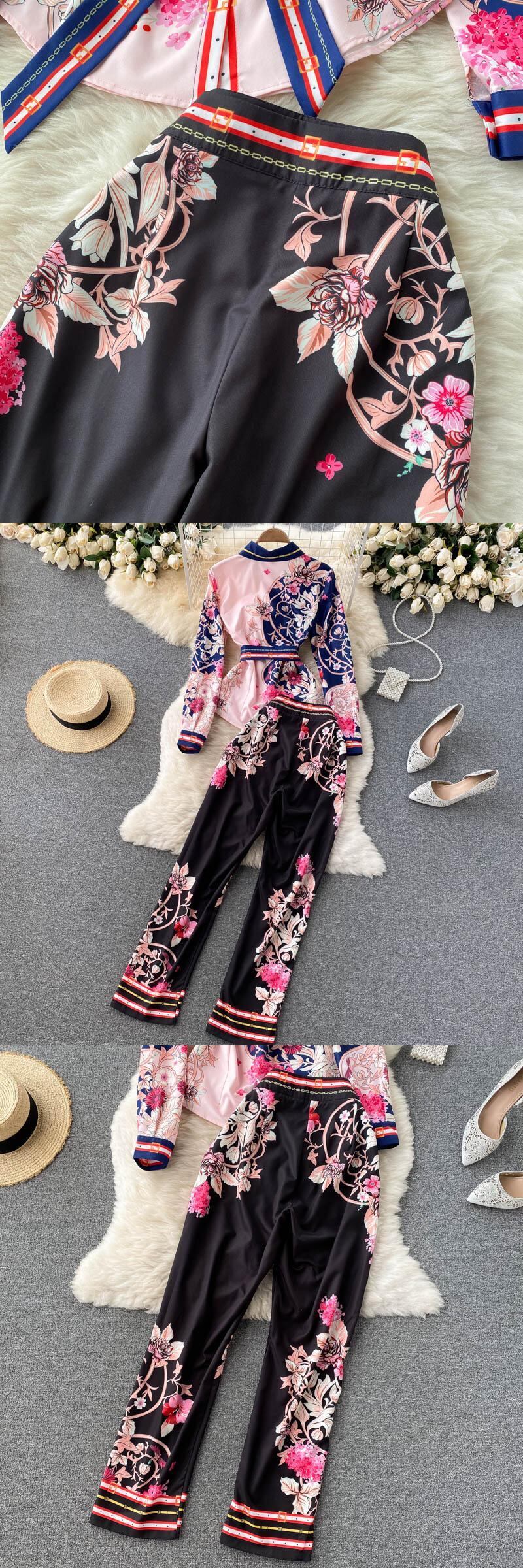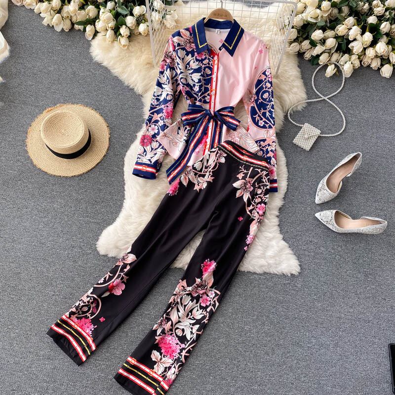 ヨーロッパとアメリカのファッションプリント2点セット2021年秋新作ウエスタンスタイル長袖シャツハイウエストワイドレッグパンツ2点セット ロング オータム 秋物 ヨーロピアン lyxaj88522750231