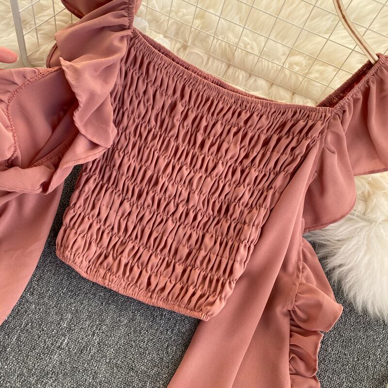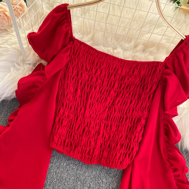 スキームリーク鎖骨スクエアカラーデザインセンスニッチ菌エッジパフスリーブスリムショートトップレディースオールマッチスモールシャツタイド スクウェア lyxaj12173215886