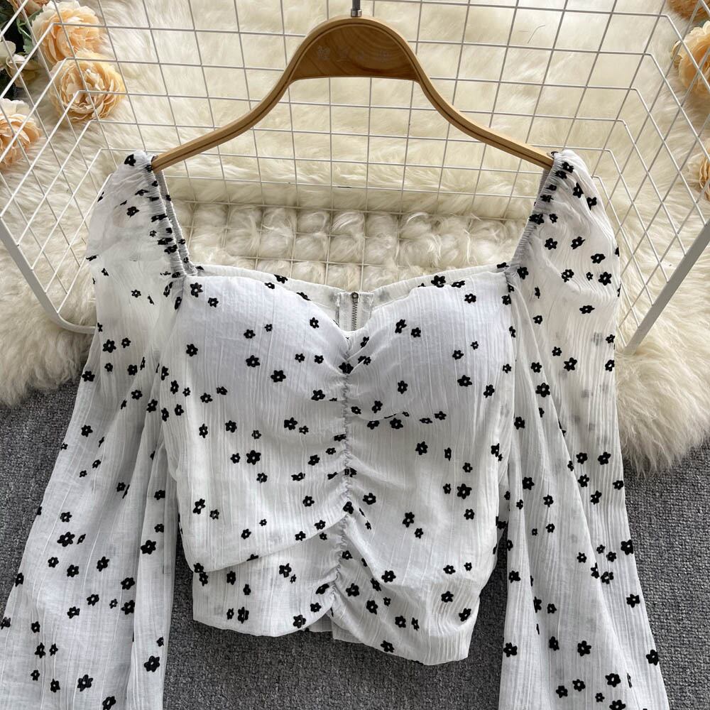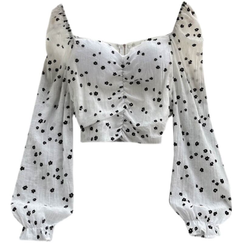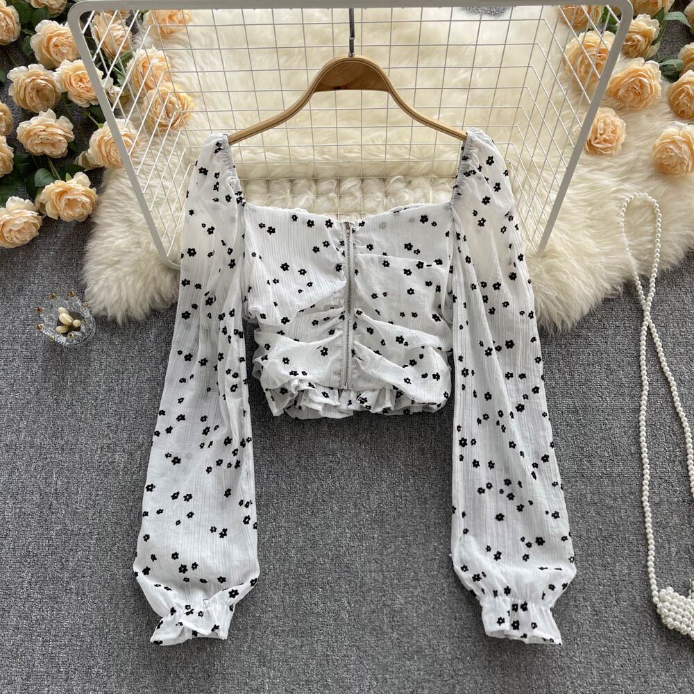 2022 spring and summer new French one-shoulder pleated printed floral niche sweet chiffon shirt short top trendy ショート シフォン プリント 大人ガーリー スウィート キュート カジュアル プリーツ スプリング 春物 サマー 夏物 花柄 lyxaj79544308784