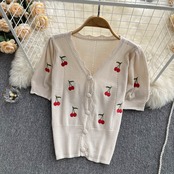 夏の新しいスタイルの文学とアート小さな新鮮で穏やかな風のデザイン中空の小さな桜の刺繡Vネック半袖ニットカーディガンの女性 刺繍 サマー 夏物 Vネック lyxaj18227602996