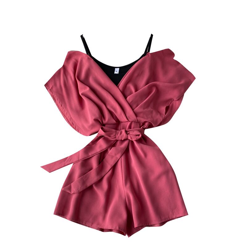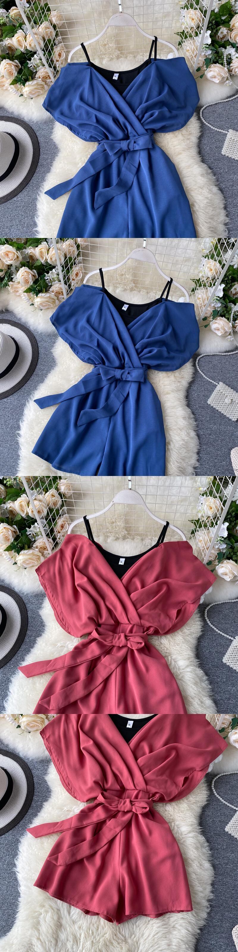 ファッションフェイクツーピースセットの韓国語バージョン慎重なマシンデザインセンスサスペンダーオフショルダー半袖ウエストネクタイワイドレッグジャンプスーツ女性 lyxaj87268038226