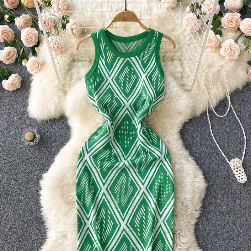 Summer new design sense of small hit color striped sleeveless knitted dress women's bag hip waist suspender long skirt ロング サマー 夏物 ノースリーブ スカート ストライプ lyxaj92307981477