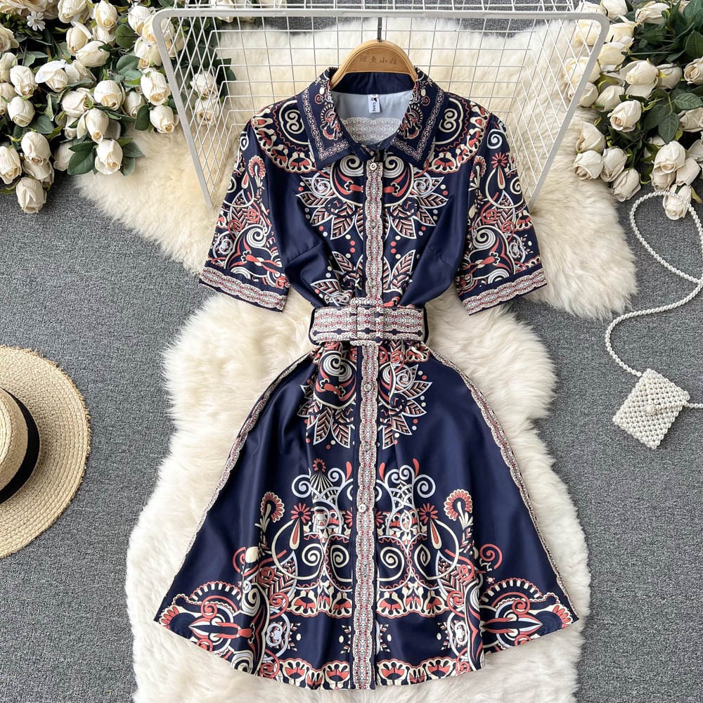2022年夏の新しい半袖ヨーロッパとアメリカのファッションラペルシングルブレストレトロパレススタイルプリントドレストレンディ レース サマー 夏物 ヨーロピアン lyxaj72704278568