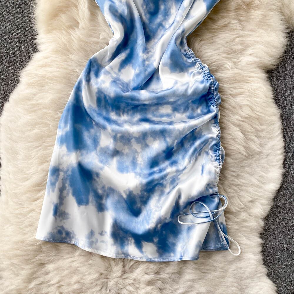 シーサイドホリデードレスレディース2022春ドレスニッチデザイン不規則絞り染め巾着ショートサスペンダースカート スプリング 春物 lyxaj38140430719