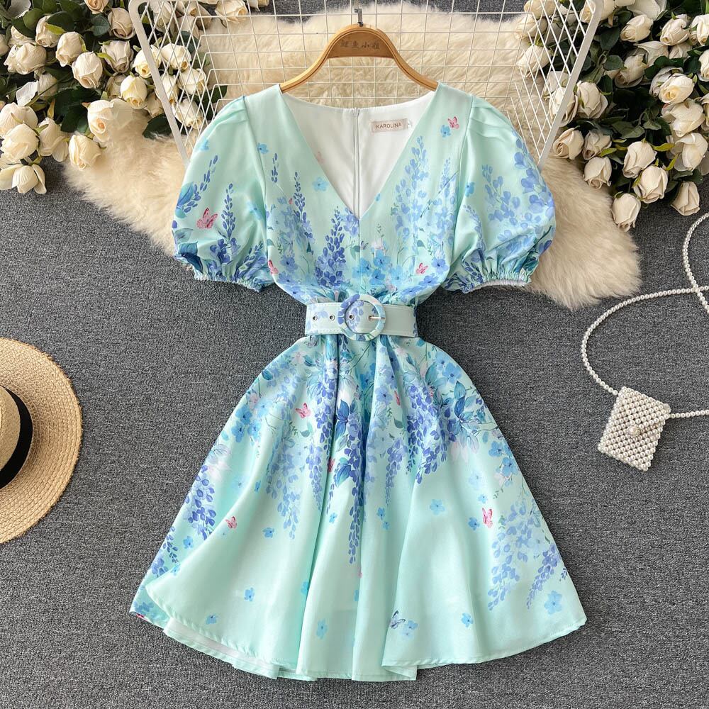 2022年新夏フレンチルーススウィートVネック半袖スカートミドル丈レースアップフローラルドレス 大人ガーリー キュート カジュアル サマー 夏物 花柄 lyxaj67543154353