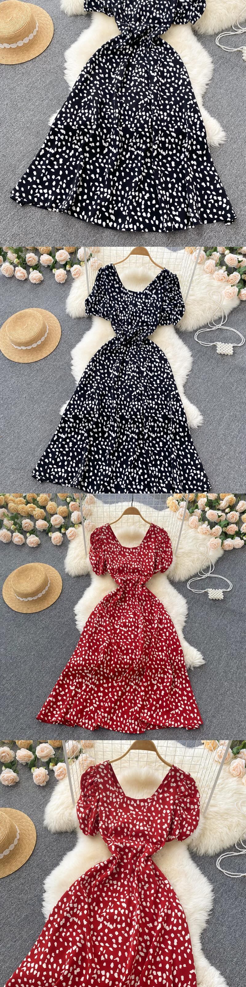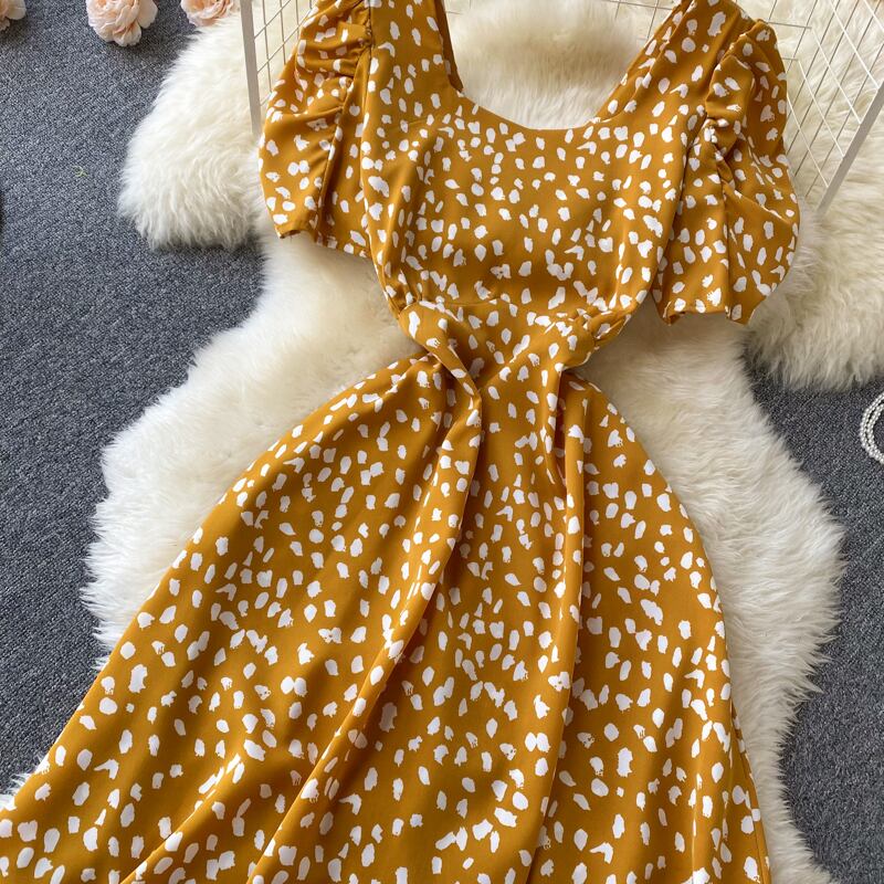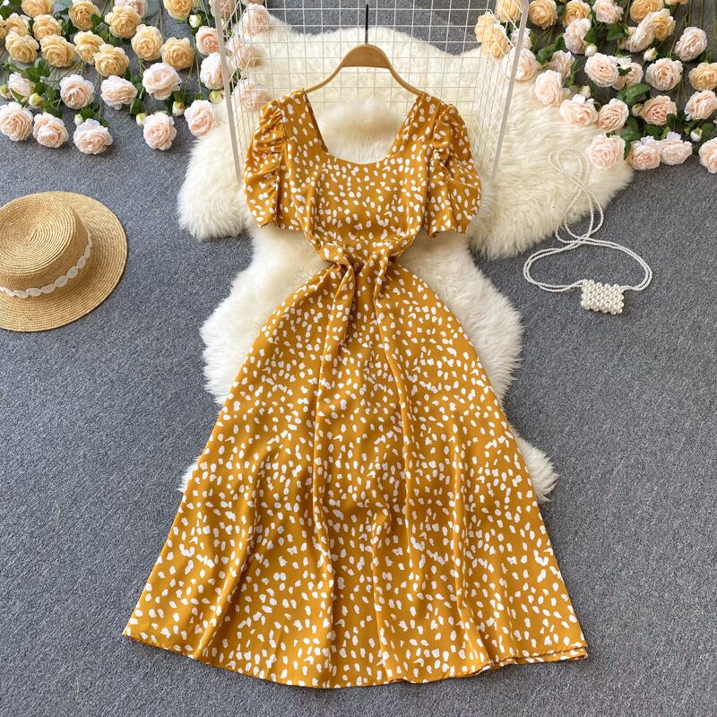 ファッションスクエアネックパフスリーブドレス半袖レディースサマードレス2021新しいハイウエストシンラージスカートAラインスカート ショート ハーフスリーブ 夏物 スクウェア lyxaj99952623808