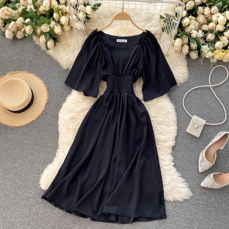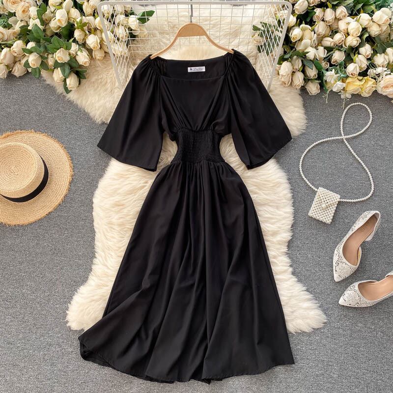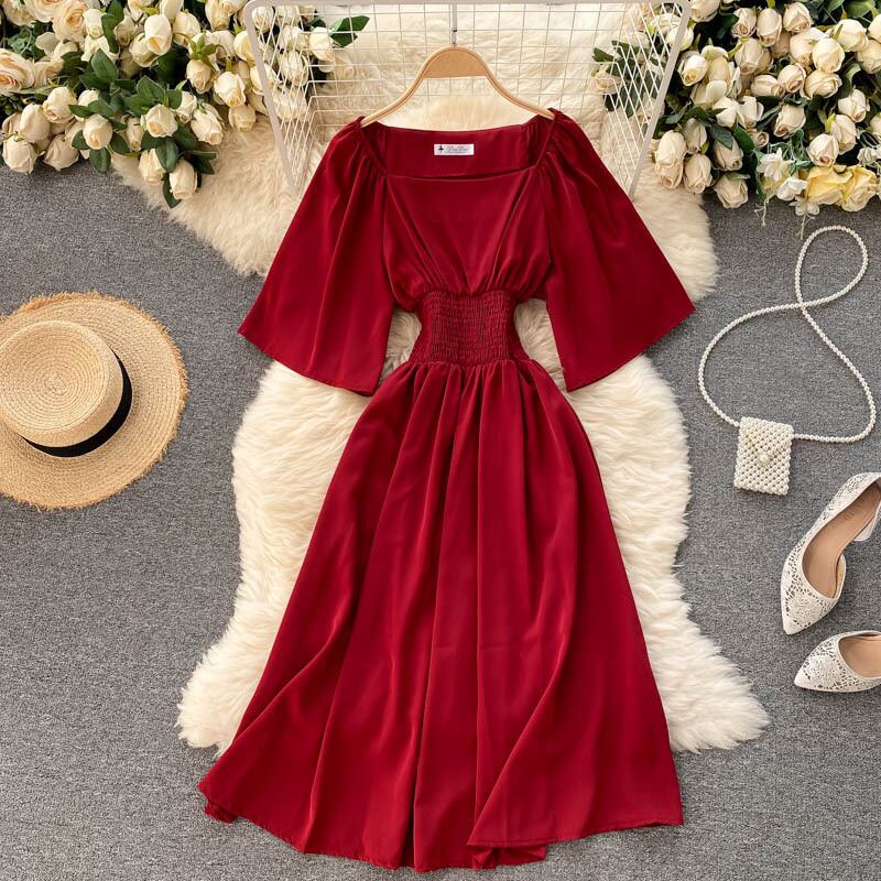 フレンチドレスレディースサマードレス2021新気質スクエアネック伸縮性ウエスト薄手ミドル丈レトロベルフラワースカート エラスティック 夏物 フラワーデザイン スクウェア lyxaj43485627352
