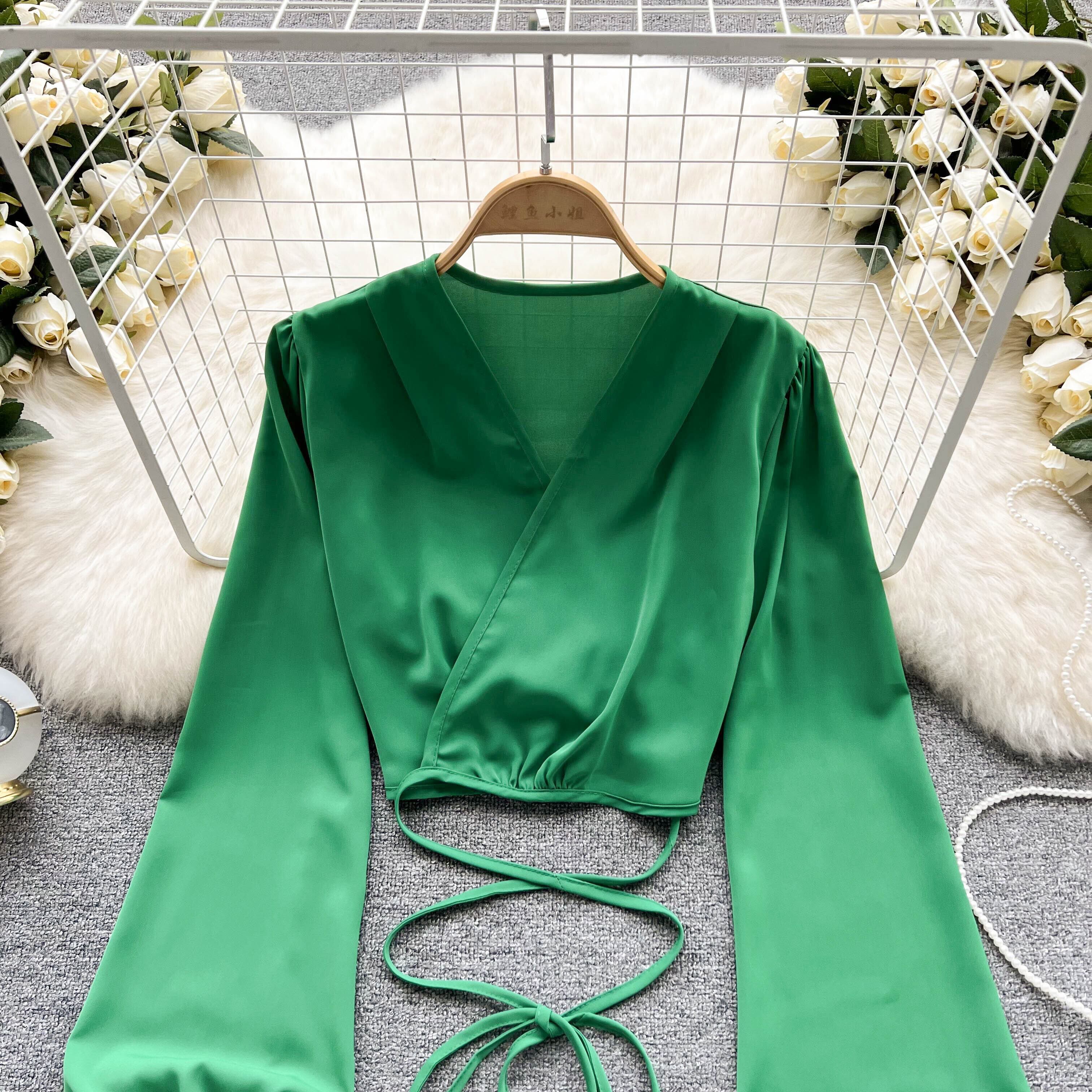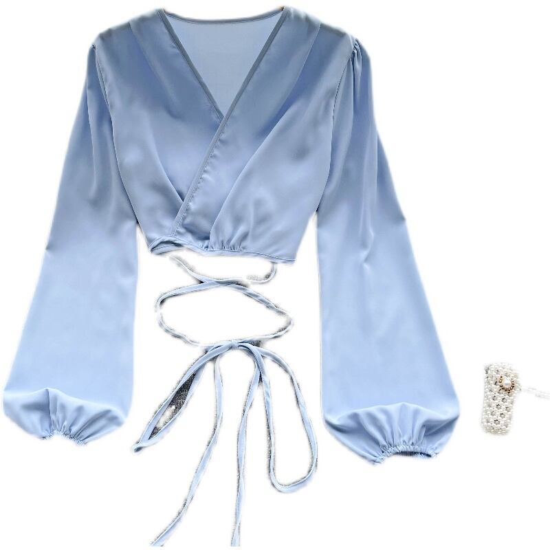 2022年春の新しい韓国版Vネックドローストリングネクタイウエストパフスリーブスモールシャツスケミング女性外国人シックトップ スプリング 春物 lyxaj32514300281