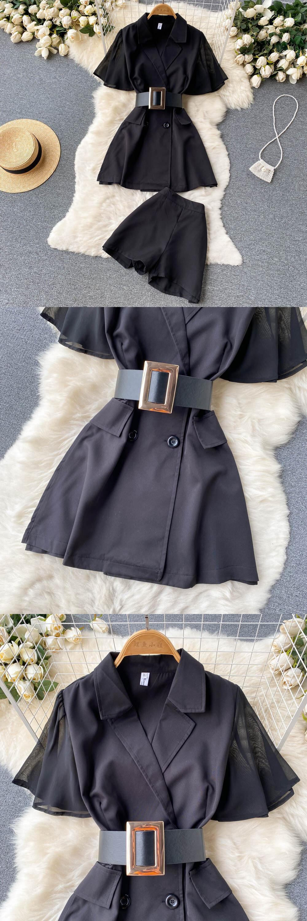 夏の新しいヘップバーンスタイルのウエストネクタイスーツの襟のドレス+カジュアルなハイウエストショーツツーピースのリトルブラックドレス ハイウェスト サマー 夏物 ブルマー lyxaj18451112542
