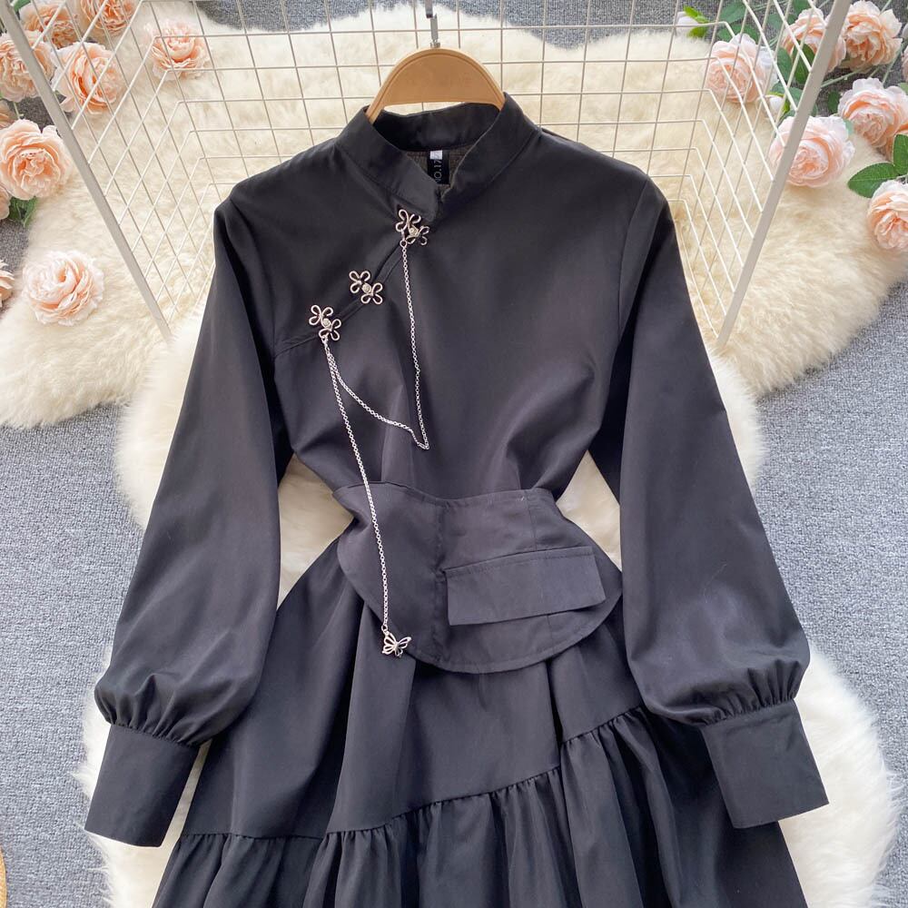 黒のロングスカート女性の春の新しいドレスレトロ傾斜ラペルチェーン長袖気質ハイウエスト大スイング小黒ドレストレンディ ハイウェスト ブラック スプリング 春物 lyxaj70655768966