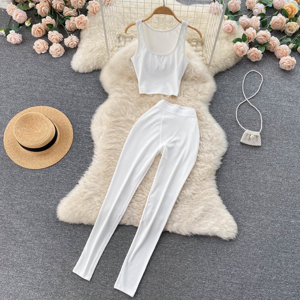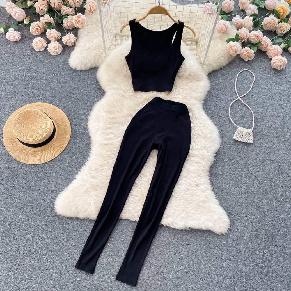 Hong Kong style retro summer new knitted suit women's sleeveless square collar short top + high waist pants two-piece trend ハイウェスト ショート レトロ サマー 夏物 ノースリーブ スクウェア lyxaj38249397489