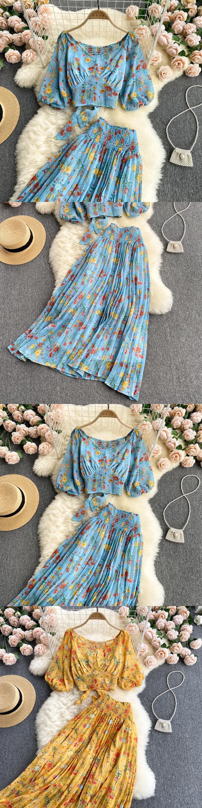 インホリデースタイルフローラルスーツレディースサマーシフォントップレディースハイウエストプリーツスカートツーピーストレンド ハイウェスト 夏物 花柄 lyxaj40028192350
