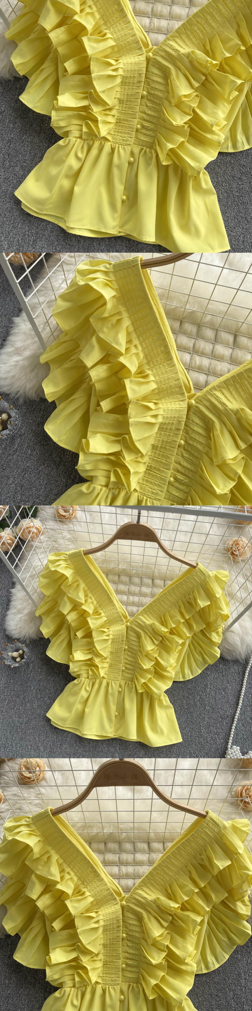 2022年夏の新しいニッチウエストスリムVネックフレンチシャツレディースレッドプリーツフリルノースリーブトップス サマー 夏物 lyxaj21828213287