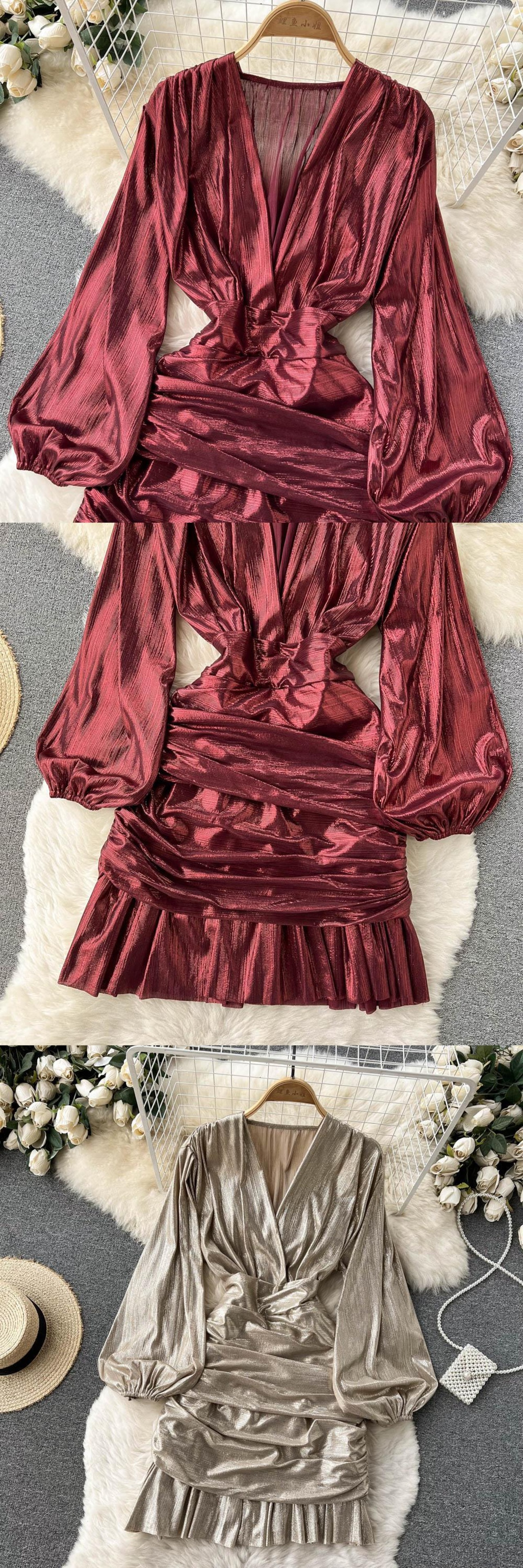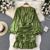 2022 Spring French Mermaid Ji V-neck Silver Bright Silk Slim Sexy Puff Sleeve Dress Annual Meeting Dress Skirt スプリング 春物 スカート Vネック スリム シルク シルバー 銀 lyxaj93192481169