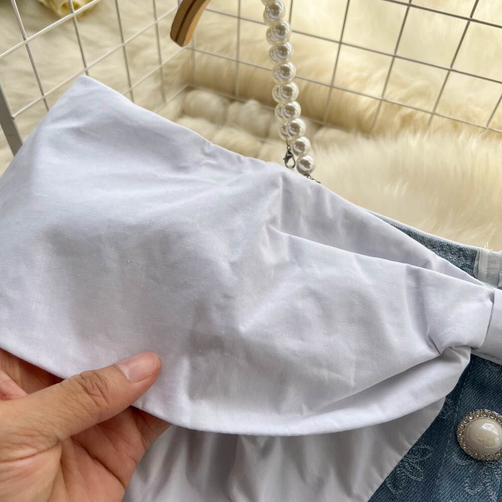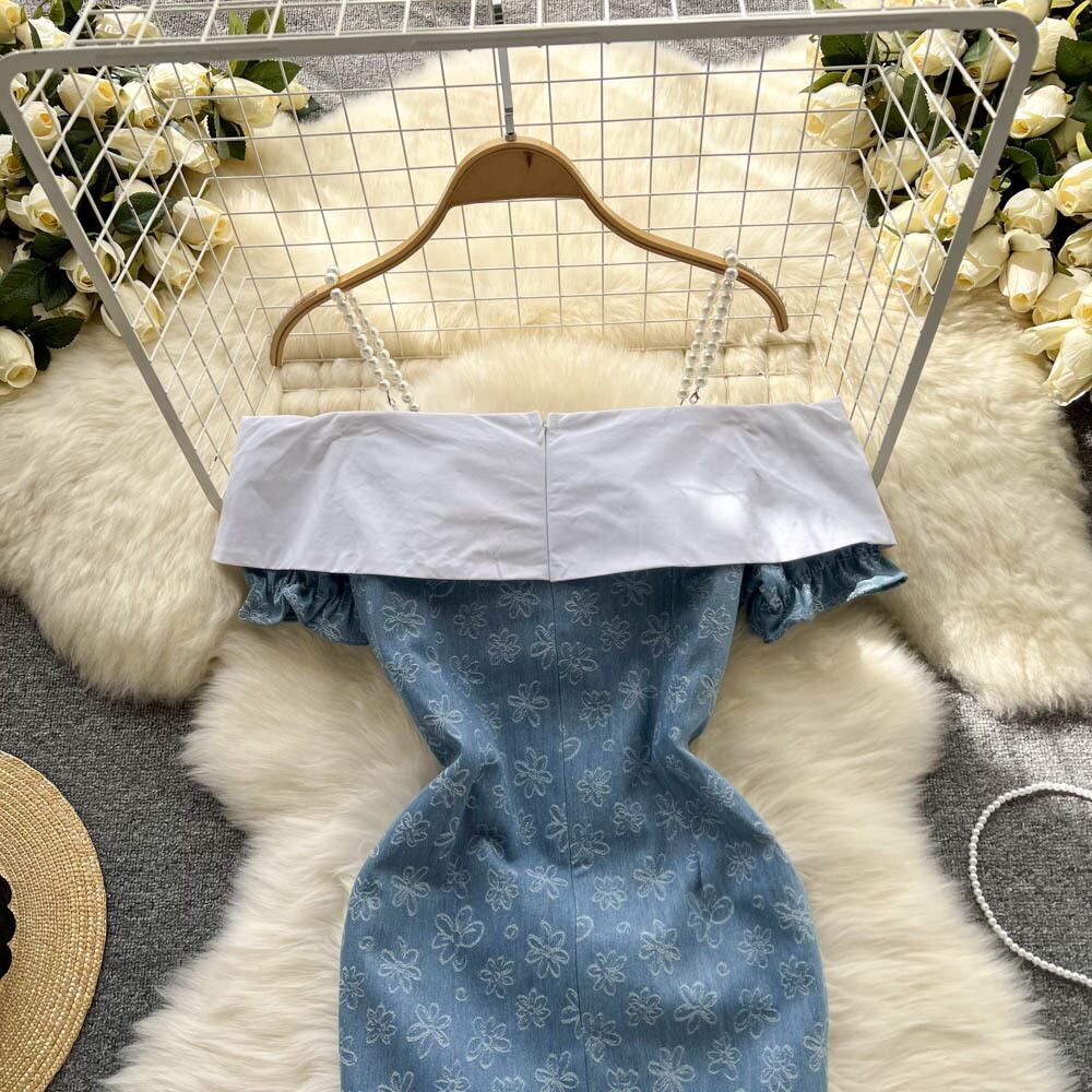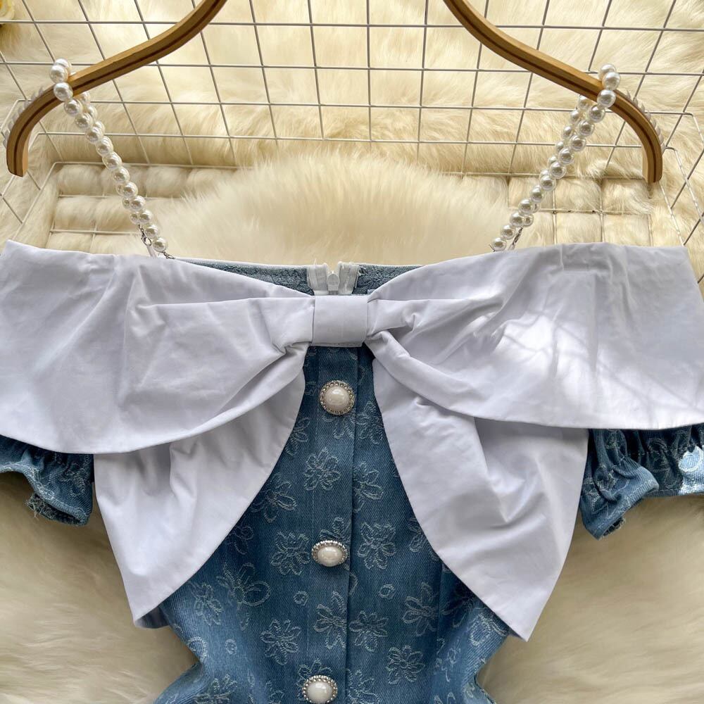 2022年夏の新しいワンネックフレンチニッチデザインプリントデニムスカートボウパールサスペンダードレス リボン サマー 夏物 真珠 lyxaj13103335098