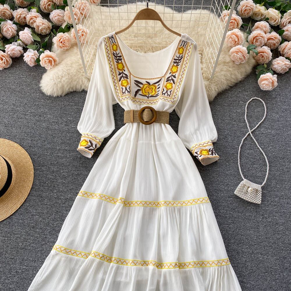 レトロなエスニックフレンチスタイルのスーパーフェアリースクエアカラー刺繍ドレス、レースウエストと薄い気質のオールマッチ大スイングロングスカート レッド スクウェア lyxaj20305196059