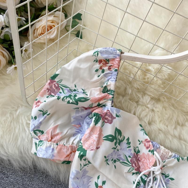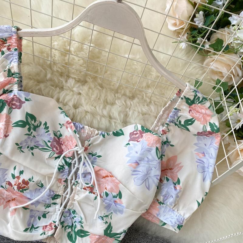 フレンチガールパフスリーブトップ2020新しいフェミニンワンピースレースアップショートへそプリントシャツ lyxaj24196795192
