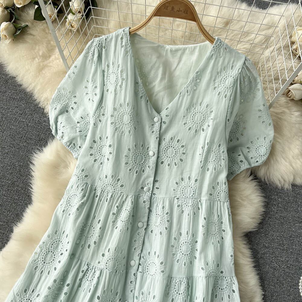 新しいボヘミアンホリデースタイルのデザインセンス中空空気品質Vネクタイボタンロングパフスリーブドレス女性 lyxaj33434133346