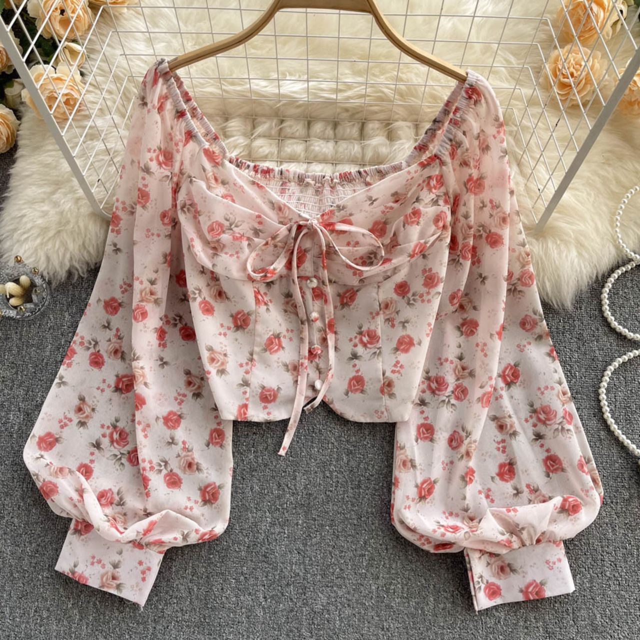 Retro Floral Small Fresh Short Navel Navel Slim Shirt Women's Lace-Up Bow Super Fairy Temperament Puff Sleeve Top ショート リボン レトロ レース 花柄 スリム レースアップ lyxaj75443082000