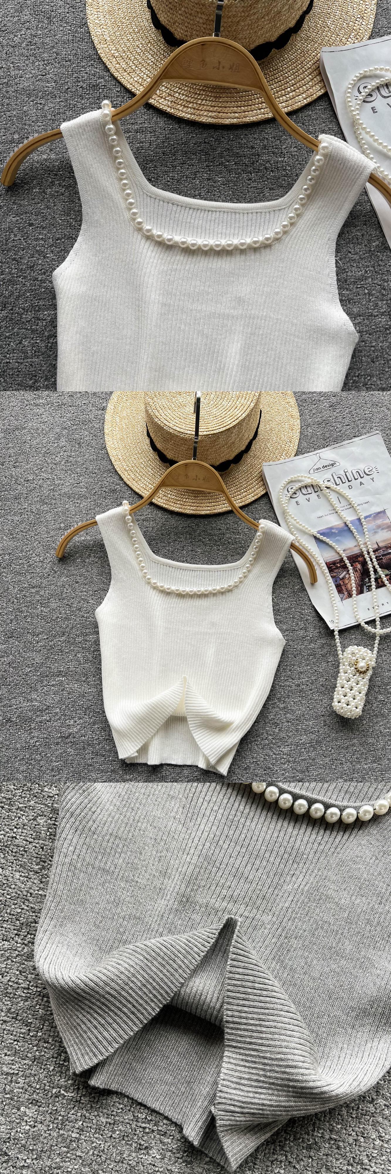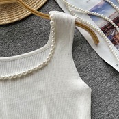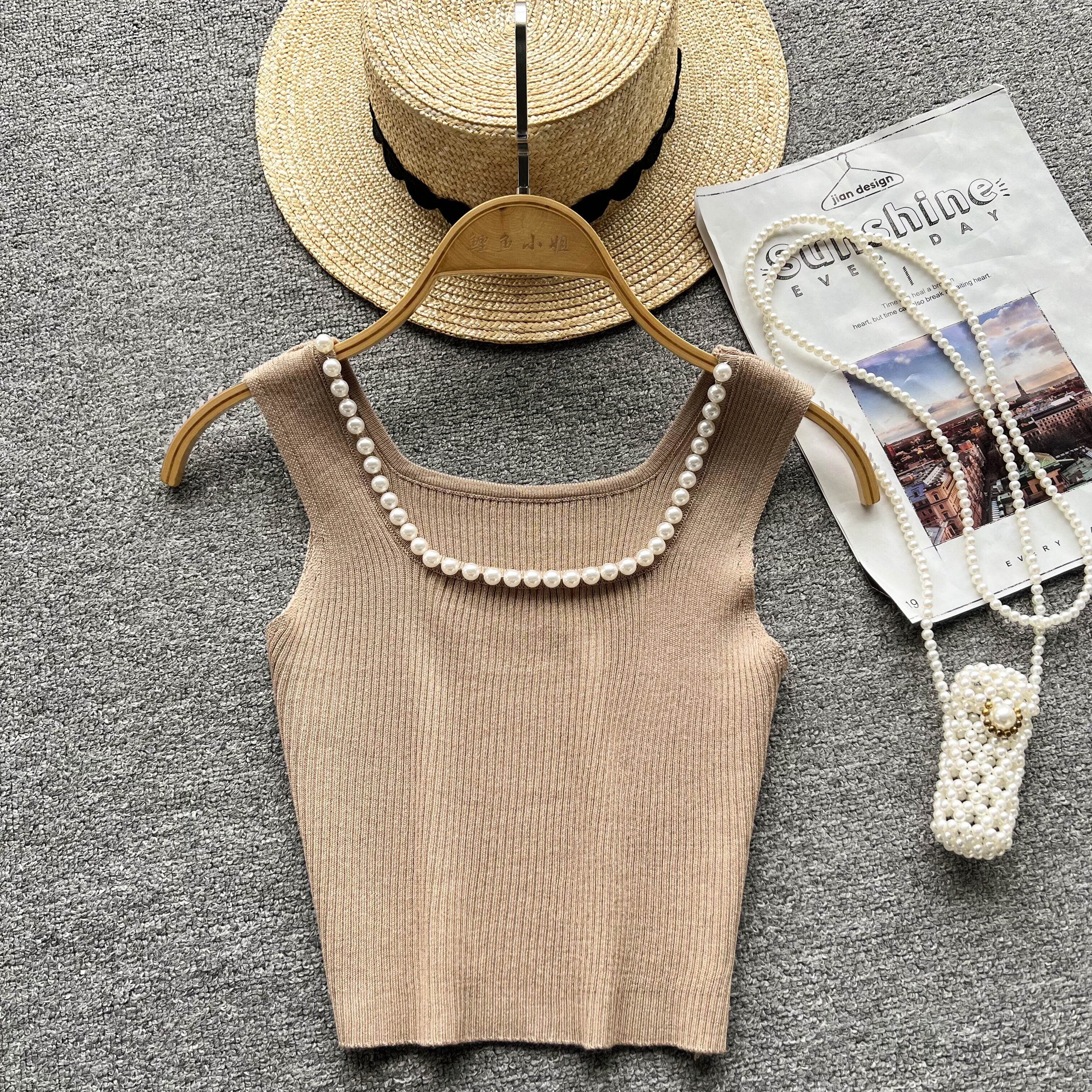 Square neck sleeveless beaded pleated camisole women's French retro small fragrance style ice silk knitted chic top レトロ プリーツ ノースリーブ シルク スクウェア lyxaj51358746841
